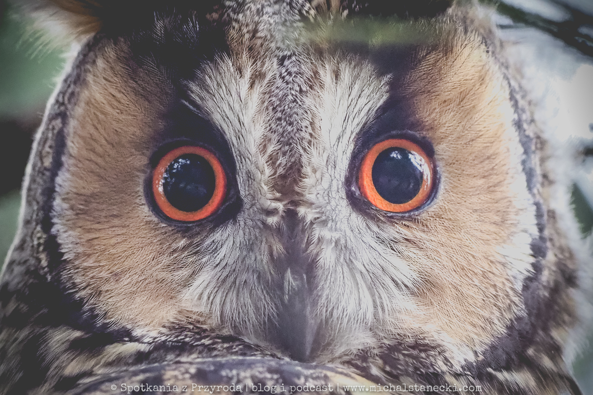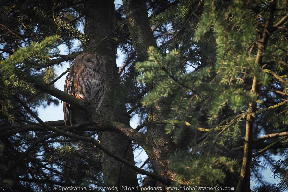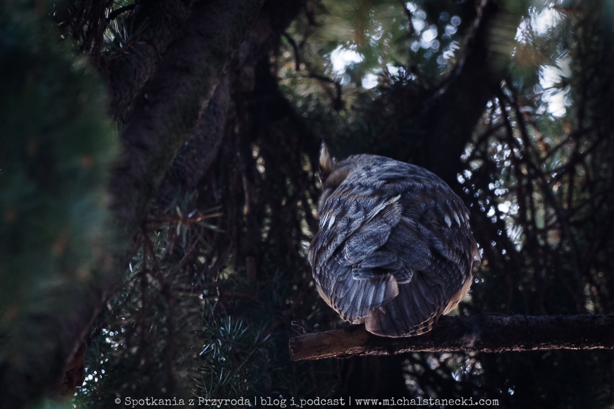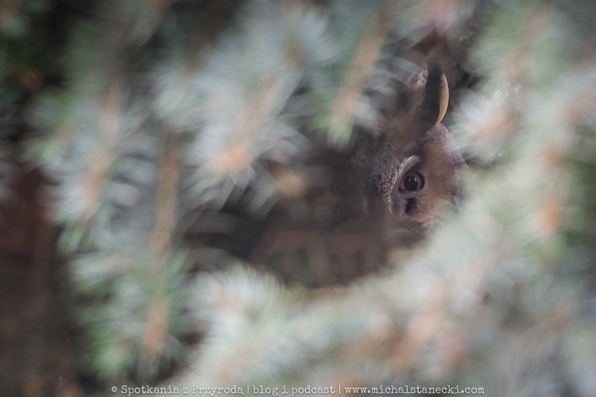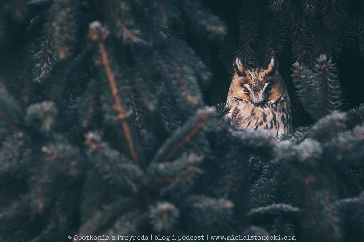 Tytułowe (powyższe) zdjęcie zostało wykonane na przydomowym drzewie, na którym zimowały uszatki. Wykonano je z chodnika, z użyciem teleobiektywu oraz przybliżenia cyfrowego w aparacie i dodatkowo w komputerze. Ptaki nie zostały spłoszone.