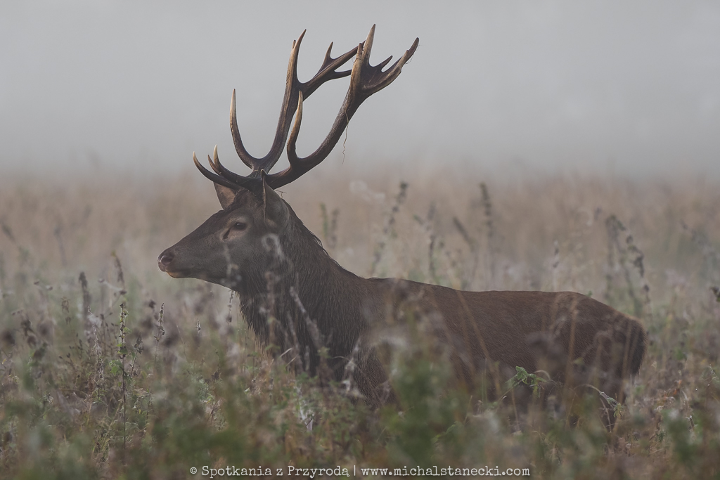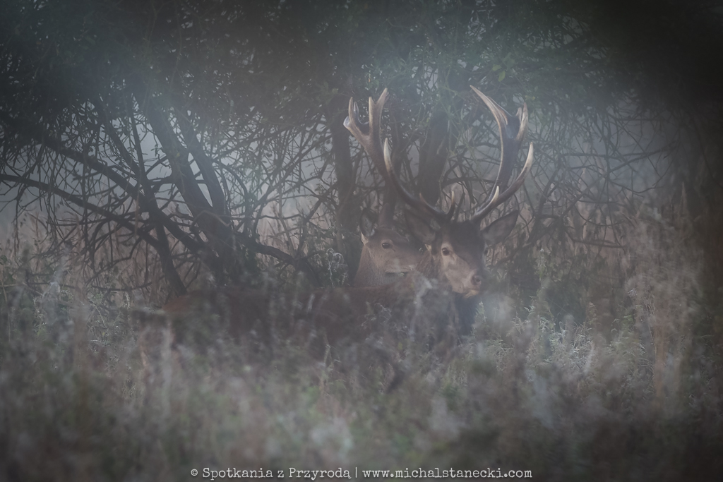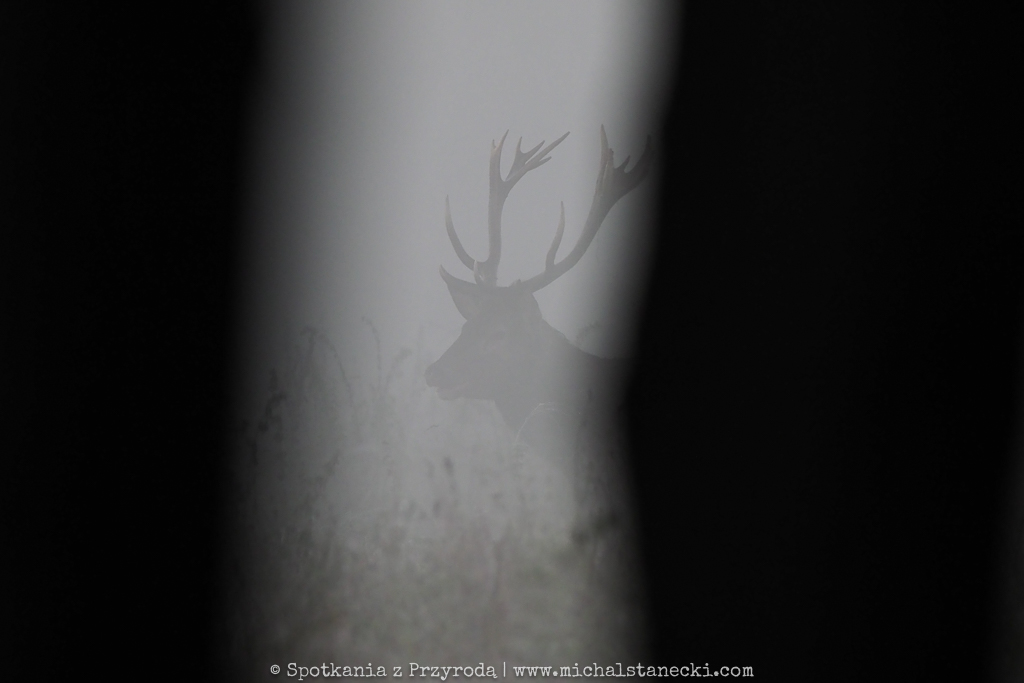 Nie oparłem się pokusie i (podobnie jak do czapli) po raz trzeci wróciłem na polanę jeleni. W ten dość ciepły i mglisty poranek spotkałem byka z dwiema łaniami. Zwierzęta zastałem na samym skraju polany, co znacznie utrudniło mi wyjście z lasu. Nie chciałem ich spłoszyć. Pierwsze zdjęcia robiłem spomiędzy drzew. Żerujące łanie powoli się oddaliły. Samiec kilka razy zaryczał przypominając, że rykowisko jeszcze się nie skończyło. Po chwili również on odszedł i zwierzęta spokojnie skierowały się do lasu. I chyba był to dla mnie jeden z ostatnich akcentów tegorocznych godów tych wspaniałych zwierząt. Do lasu jeleni zajrzę jeszcze pewnie zimą, a za rok znów wrócę do matecznika doświadczyć tego niesamowitego przeżycia …
