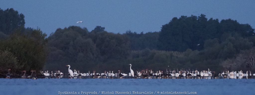 ogromne międzygatunkowe stado składające się z czapli, łabędzi, żurawi, gęgaw, krakw, krzyżówek, łysek, śmieszek i pewnie jeszcze kilku innych gatunków