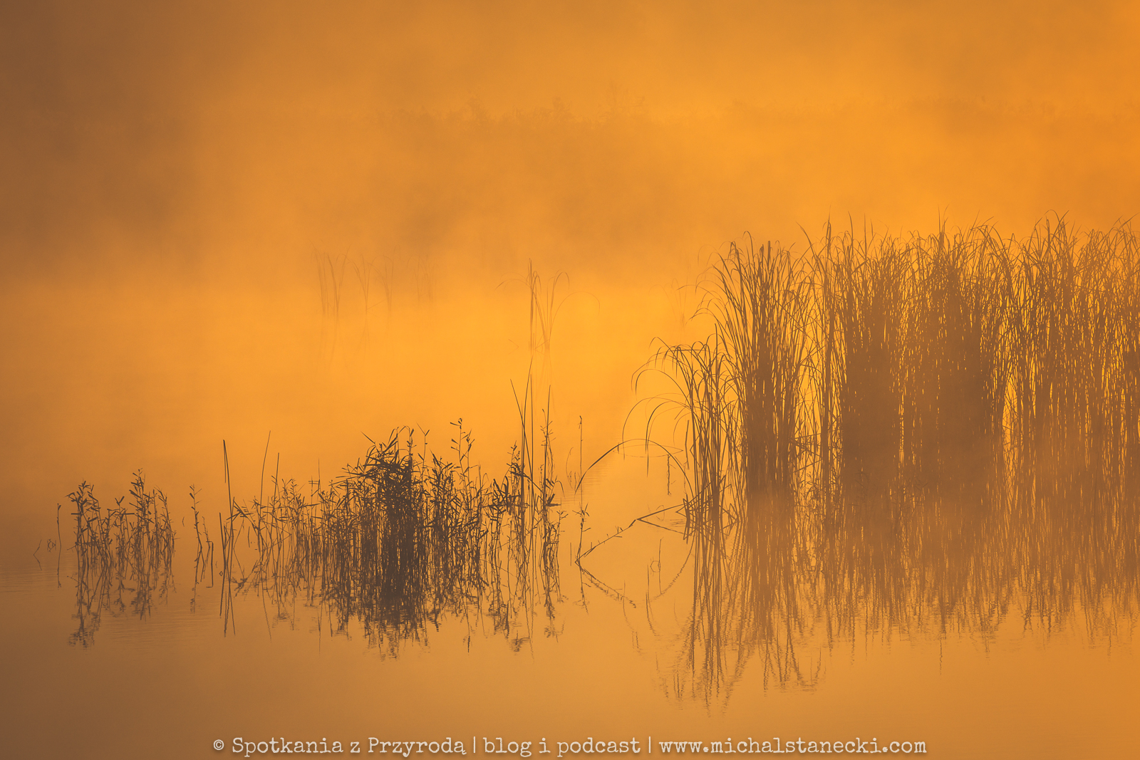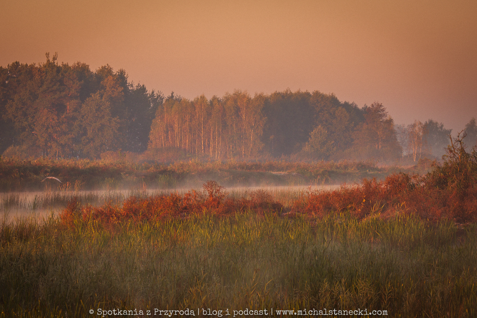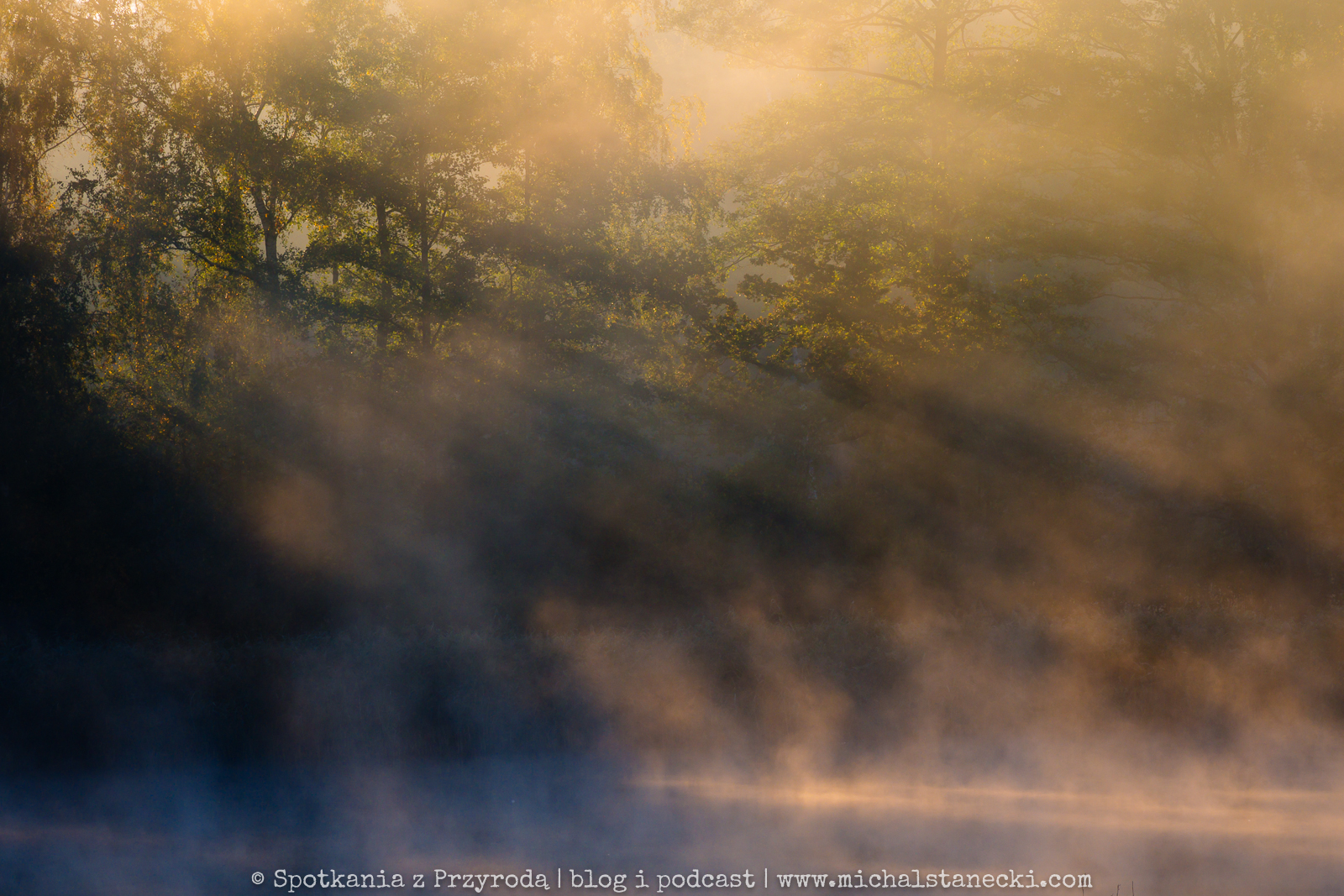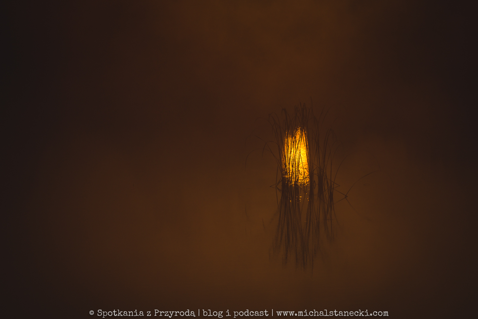 Noc spędzaliśmy w lesie, na naszej działce. Obudziłem się u schyłku nocy. Niespiesznie wstałem (przyszły do mnie dwa ciepłe psy), napaliłem w piecu, żeby śpiochy miały ciepło, zrobiłem sobie kawę na wynos i ruszyłem na pobliskie stawy. Gdy pierwsze światła zaczęły się przepychać z mgłami, spokojnie wiszącymi nad wodą, zaczęły dziać się czary. Nad horyzont zaczęły się wysuwać kolejne barwy wypychane przez wschodzące słońce, a wokół zagrały jesienne przebarwienia. Ehh, ale to był widok … Mocne doznania estetyczne i wielkie emocjonalne poruszenie. Wszytko to podsycane przez zapach rześkiego, mroźnego powietrza, które nieźle szczypało w nos i wychładzało dłonie.