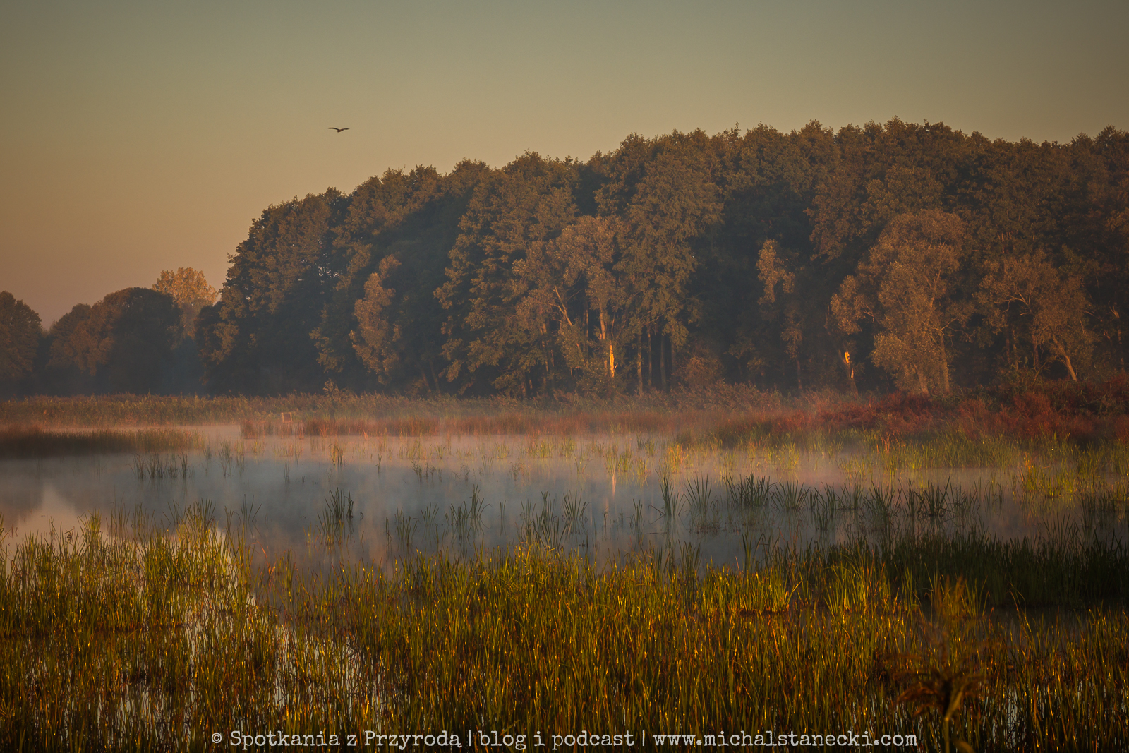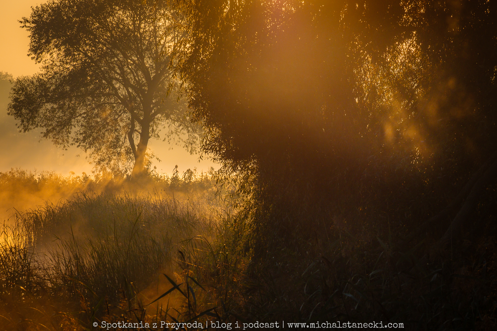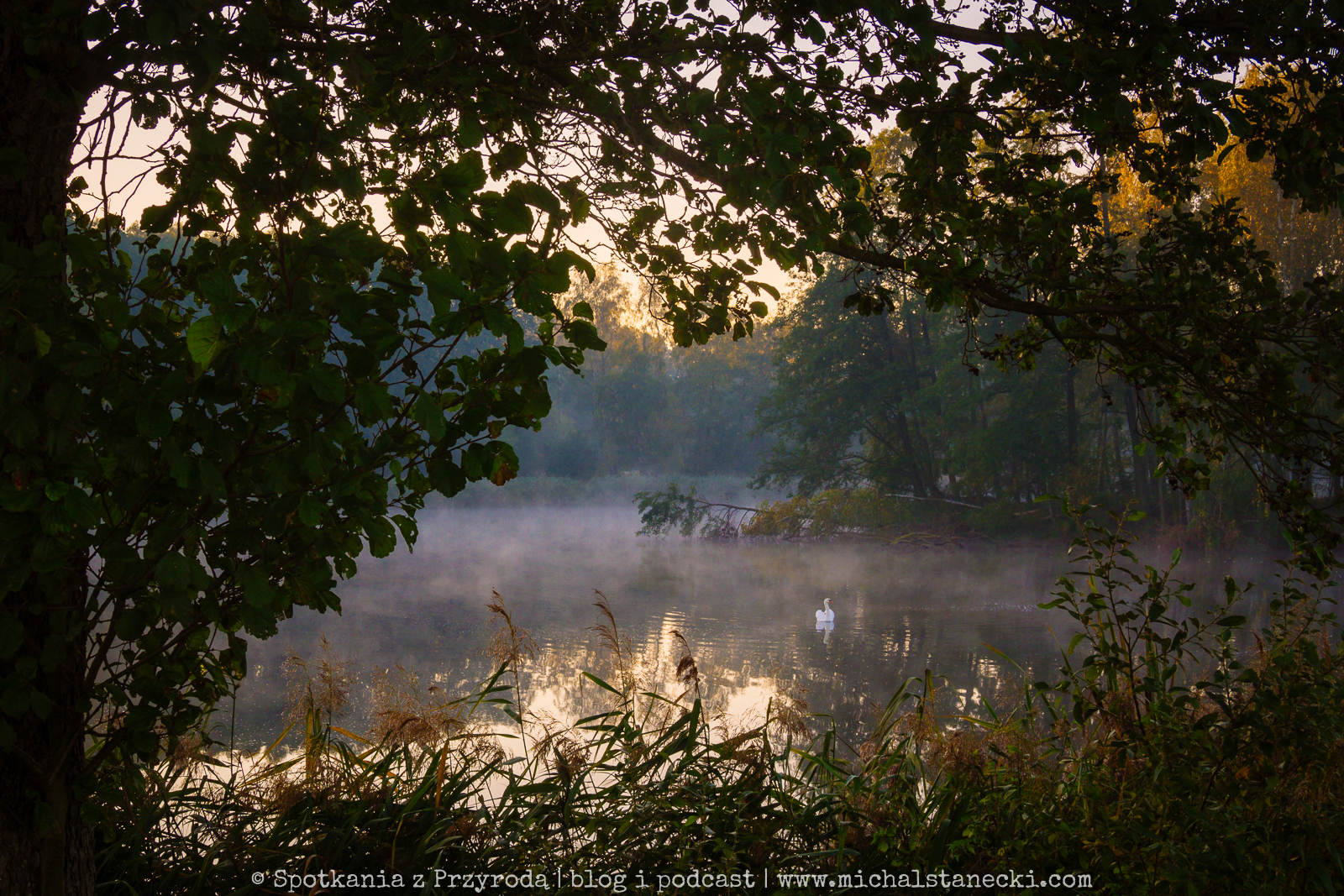 Noc spędzaliśmy w lesie, na naszej działce. Obudziłem się u schyłku nocy. Niespiesznie wstałem (przyszły do mnie dwa ciepłe psy), napaliłem w piecu, żeby śpiochy miały ciepło, zrobiłem sobie kawę na wynos i ruszyłem na pobliskie stawy. Gdy pierwsze światła zaczęły się przepychać z mgłami, spokojnie wiszącymi nad wodą, zaczęły dziać się czary. Nad horyzont zaczęły się wysuwać kolejne barwy wypychane przez wschodzące słońce, a wokół zagrały jesienne przebarwienia. Ehh, ale to był widok … Mocne doznania estetyczne i wielkie emocjonalne poruszenie. Wszytko to podsycane przez zapach rześkiego, mroźnego powietrza, które nieźle szczypało w nos i wychładzało dłonie.