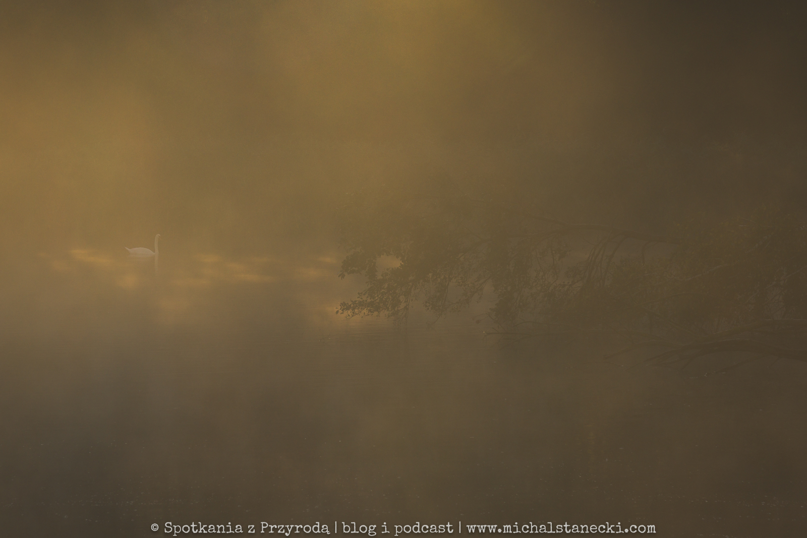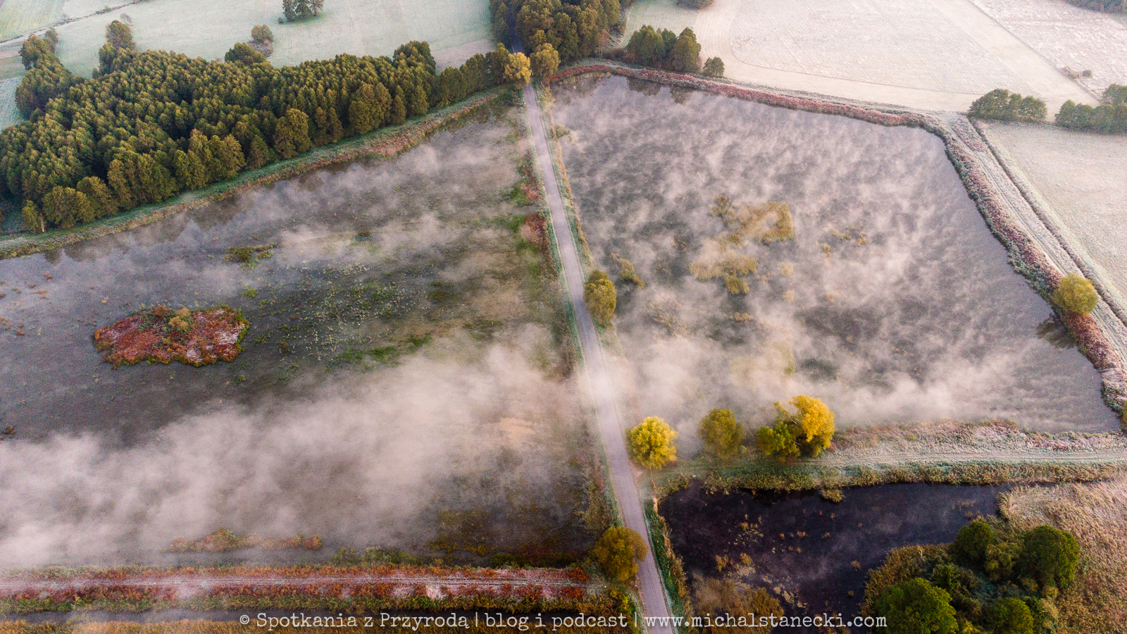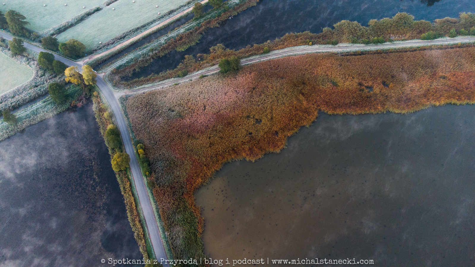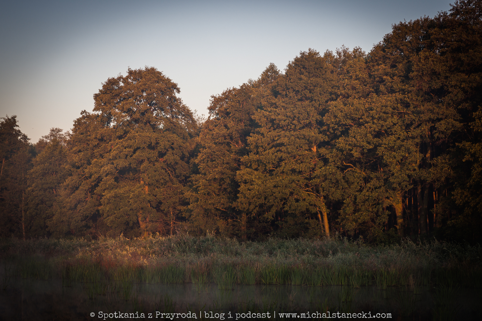 Noc spędzaliśmy w lesie, na naszej działce. Obudziłem się u schyłku nocy. Niespiesznie wstałem (przyszły do mnie dwa ciepłe psy), napaliłem w piecu, żeby śpiochy miały ciepło, zrobiłem sobie kawę na wynos i ruszyłem na pobliskie stawy. Gdy pierwsze światła zaczęły się przepychać z mgłami, spokojnie wiszącymi nad wodą, zaczęły dziać się czary. Nad horyzont zaczęły się wysuwać kolejne barwy wypychane przez wschodzące słońce, a wokół zagrały jesienne przebarwienia. Ehh, ale to był widok … Mocne doznania estetyczne i wielkie emocjonalne poruszenie. Wszytko to podsycane przez zapach rześkiego, mroźnego powietrza, które nieźle szczypało w nos i wychładzało dłonie.