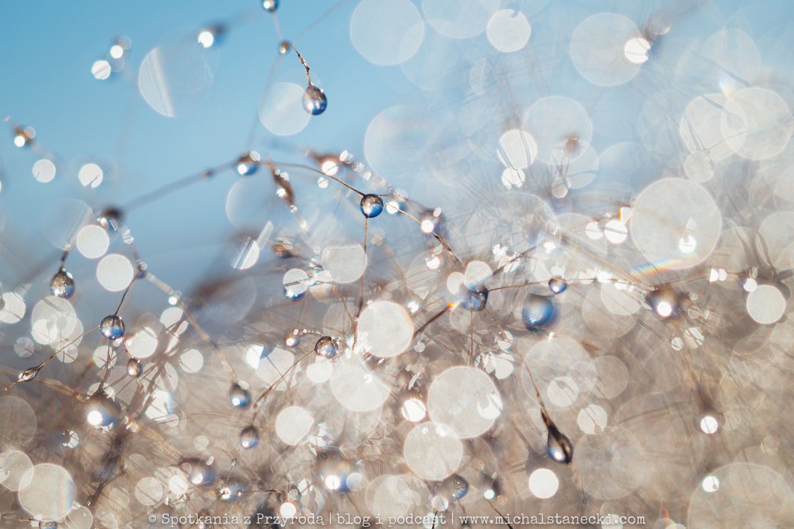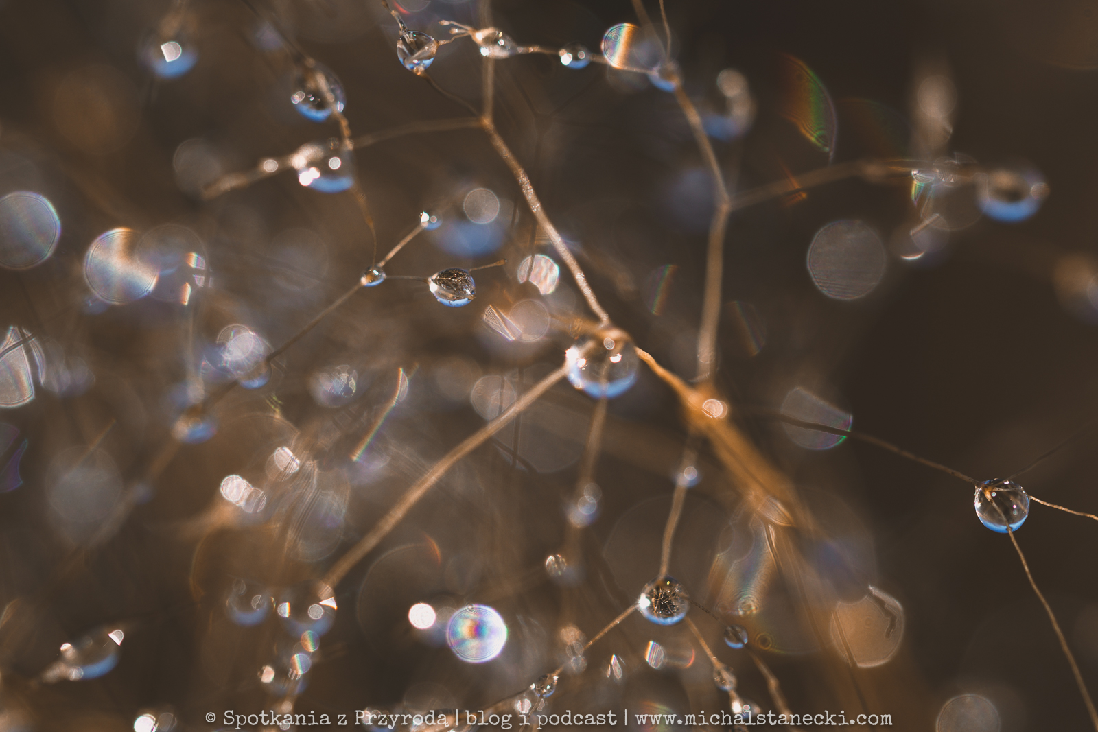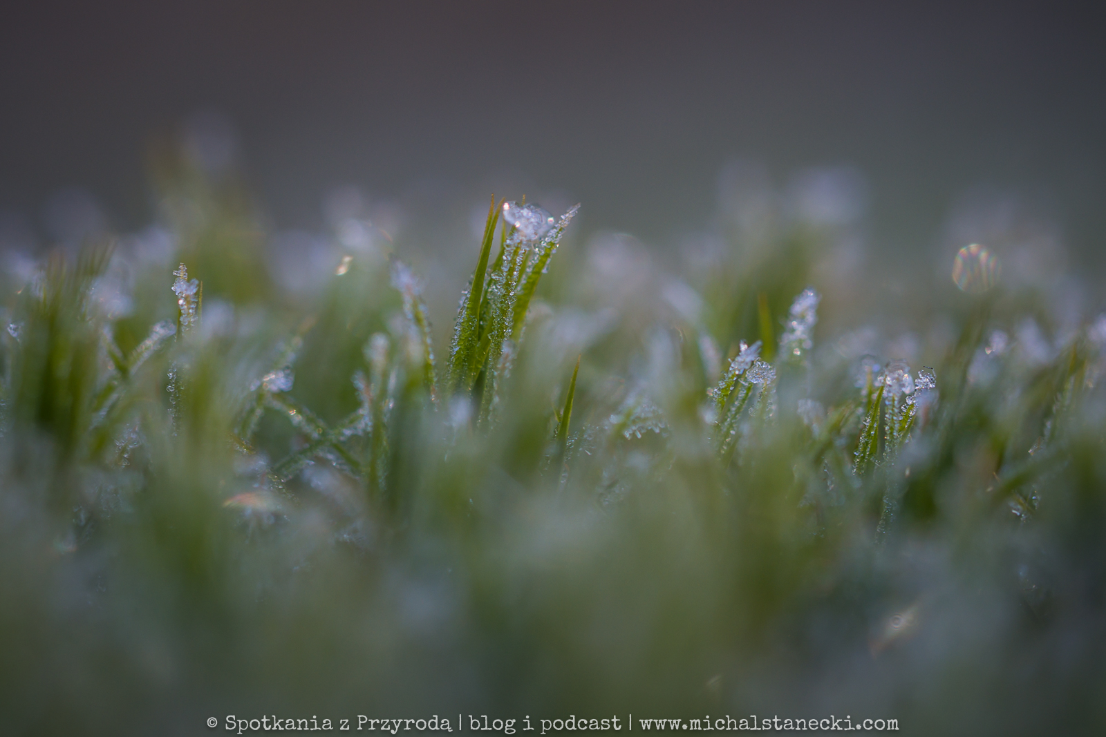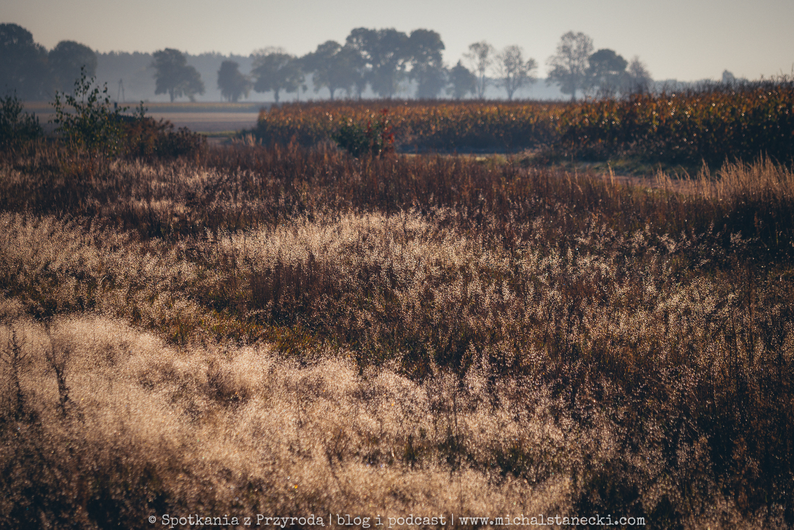 Gdy wracałem, zatrzymałem się jeszcze na łące, na której ciepło promieni słonecznych zaczęło rozpuszczać drobinki lodu, które w trakcie nocy, na drobnych roślinach wyczarował mróz. To dopełniło przeżycia tego poranka i zbudowało mój cały dzień. Dla takich poranków warto zarywać czarne i chłodne, jesienne noce. Zdecydowanie warto …