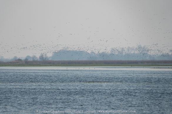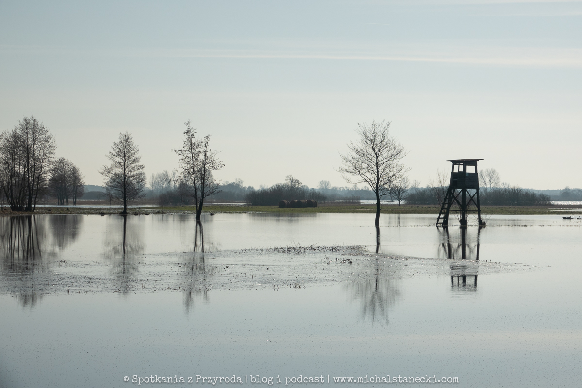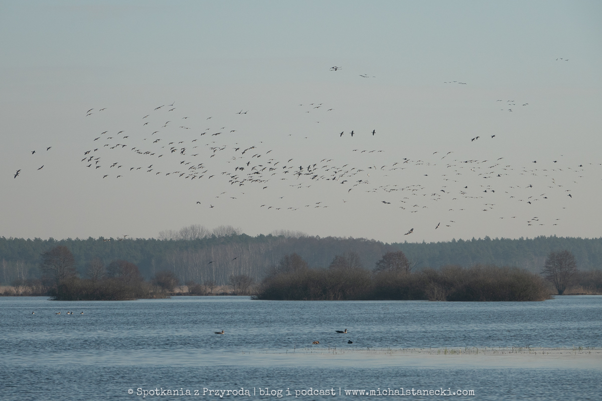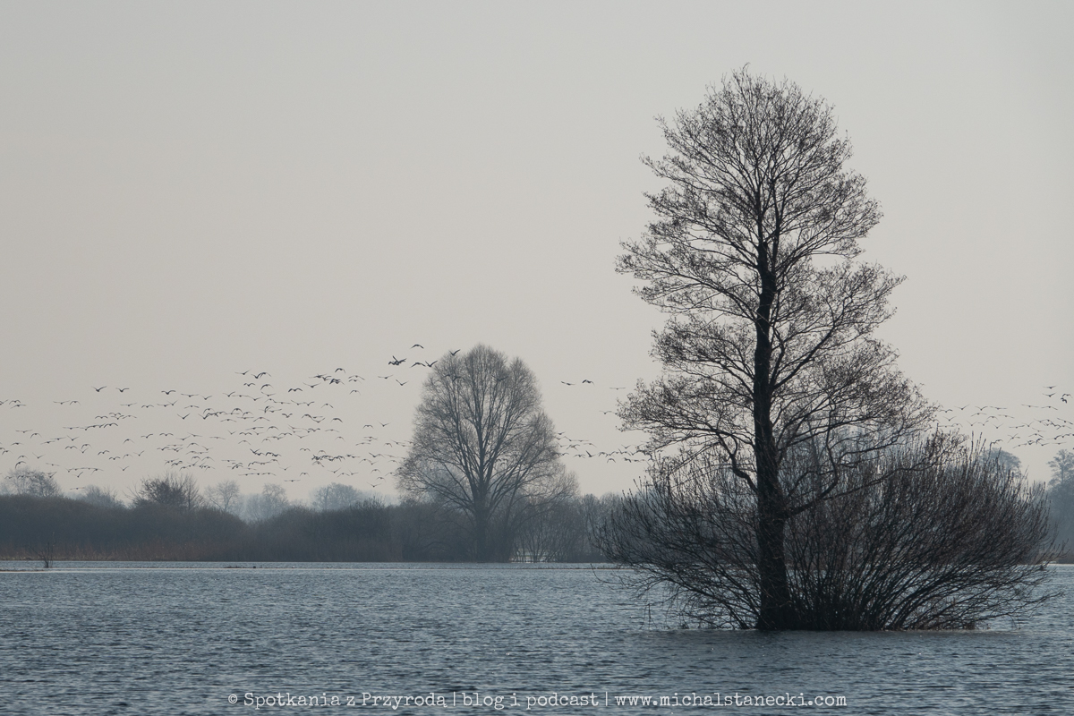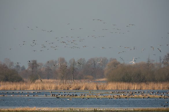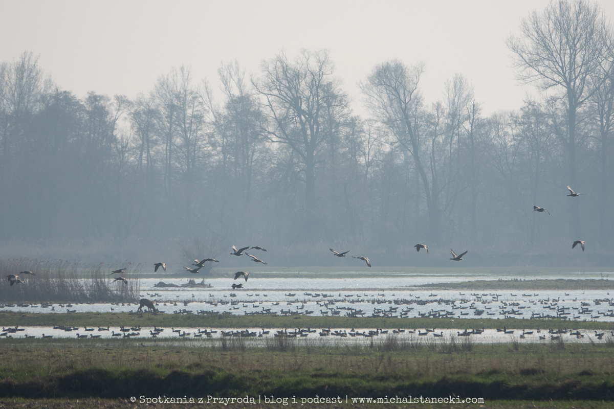 Oto fotograficzny zapis przedwiośnia w Dolinie Neru. Takiej wody nie pamiętamy od wielu lat. Z wielkich rozlewisk korzystają migrujące ptaki, wśród których dominują gęsi, których nocujących w dolinie ornitolodzy naliczyli tego dnia około 14 000. W powietrzu, na wodzie i na łąkach widzieliśmy tez kilka gatunków kaczek, czajki, siewki złote, żurawie, skowronki i lerki, a wśród zadrzewień słychać rozkrzyczane dzięcioły. Bonusem było kilka saren, a także trzy jelenie, które przeprawiały się przez wodę pomiędzy zaroślami. Słoneczny dzień w dolinie, to dla nas i innych spotkanych obserwatorów i miłośników przyrody.