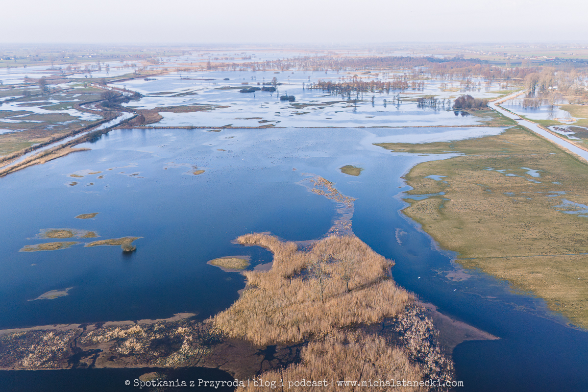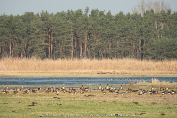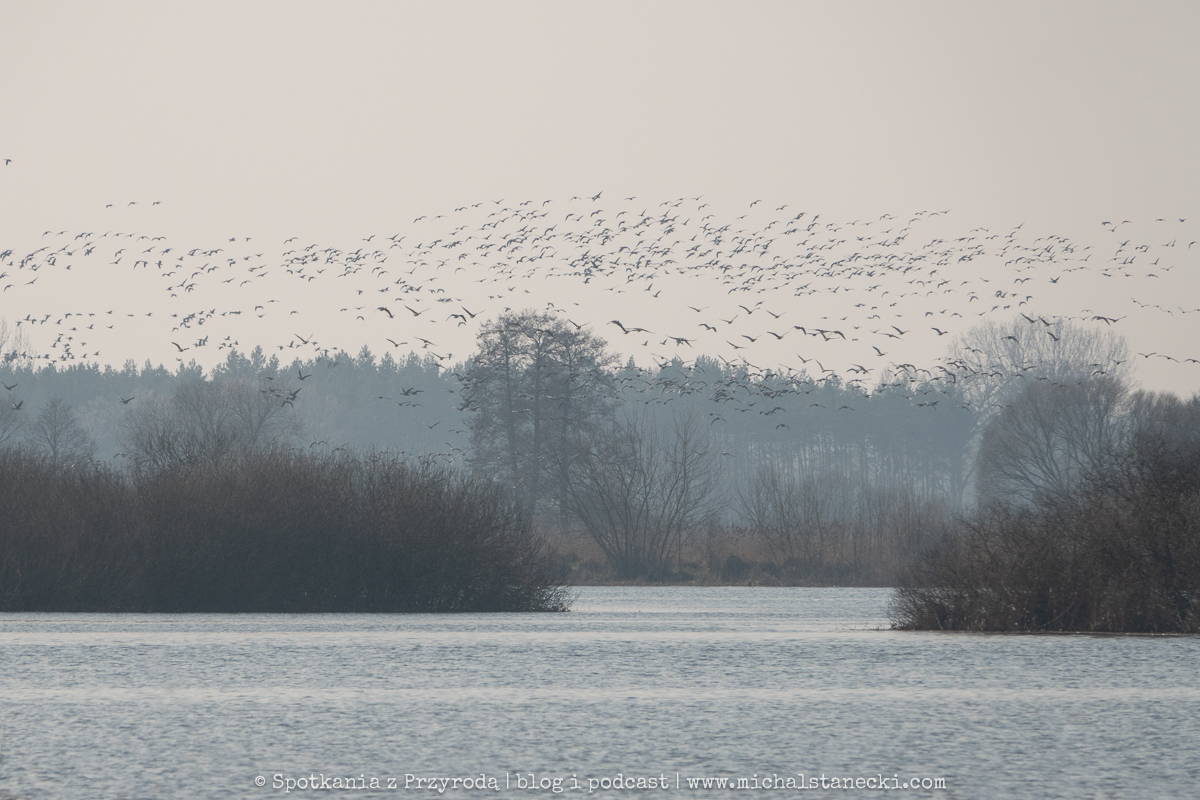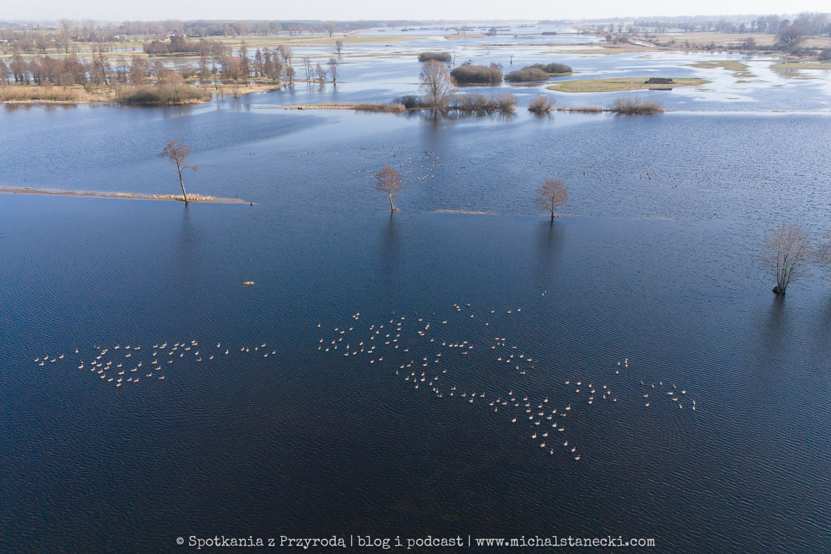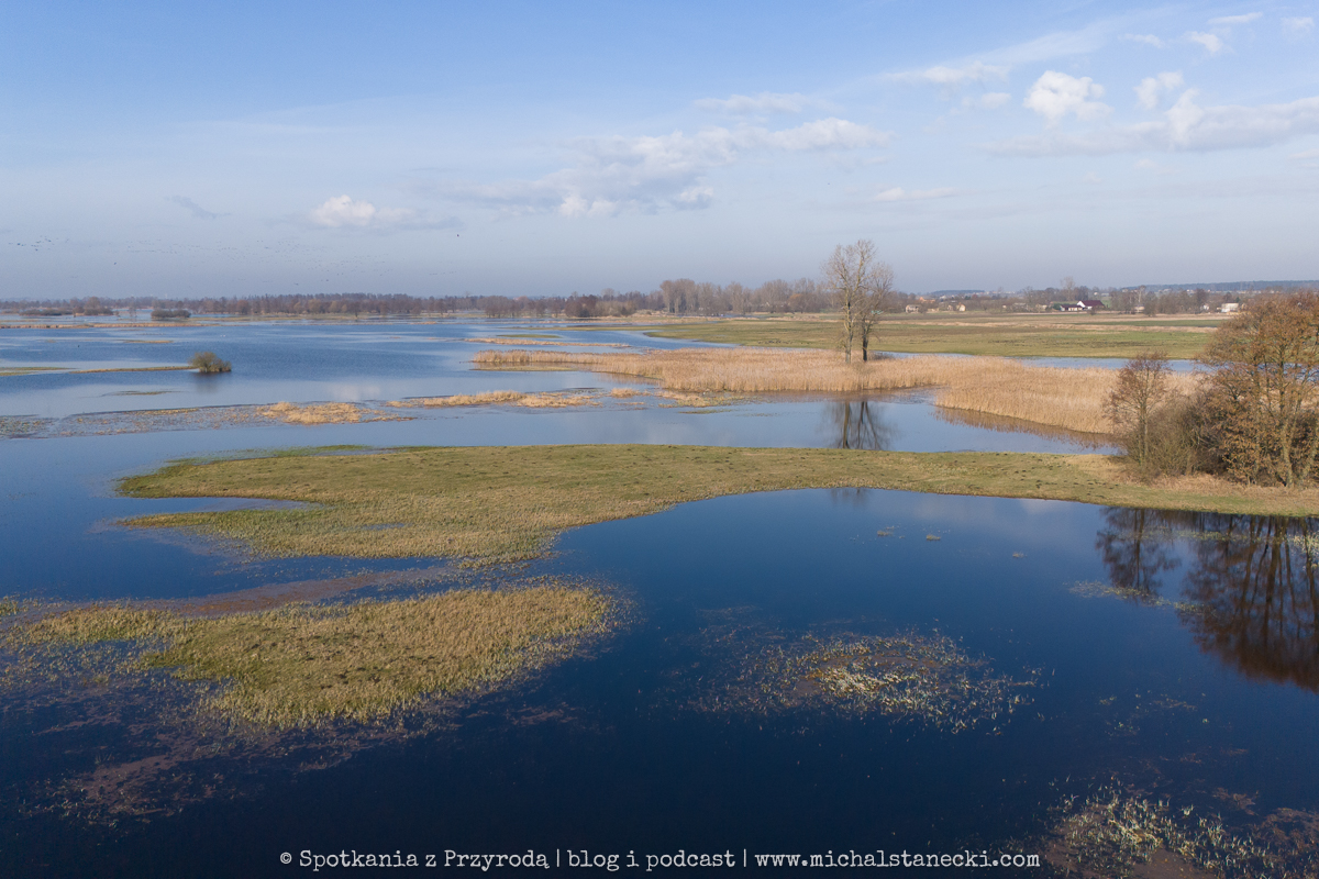 Oto fotograficzny zapis przedwiośnia w Dolinie Neru. Takiej wody nie pamiętamy od wielu lat. Z wielkich rozlewisk korzystają migrujące ptaki, wśród których dominują gęsi, których nocujących w dolinie ornitolodzy naliczyli tego dnia około 14 000. W powietrzu, na wodzie i na łąkach widzieliśmy tez kilka gatunków kaczek, czajki, siewki złote, żurawie, skowronki i lerki, a wśród zadrzewień słychać rozkrzyczane dzięcioły. Bonusem było kilka saren, a także trzy jelenie, które przeprawiały się przez wodę pomiędzy zaroślami. Słoneczny dzień w dolinie, to dla nas i innych spotkanych obserwatorów i miłośników przyrody.