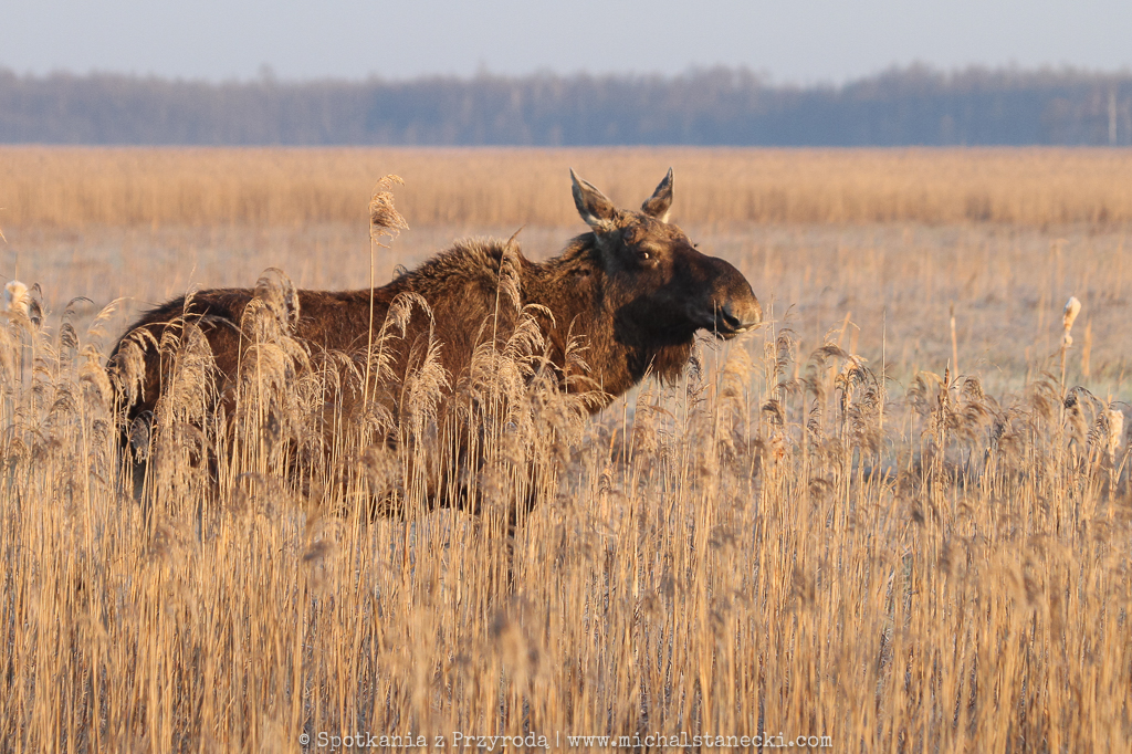 Kilka lat temu, będąc w Dolinie Biebrzy, postanowiłem przejść się wczesnym rankiem kładką prowadzącą nad torfowiskiem. To okolica, w której rano i wieczorem lubią „paść się” łosie. Tak było i tym razem. Nie musiałem długo czekać. Przez podmokłe trzcinowisko szła w moją stronę samotna klempa. Ponieważ biebrzańskie łosie nie uciekają na widok człowieka, wiedziałem, że jeśli zaczekam cierpliwie nie wykonując gwałtownych ruchów, zwierzą podejdzie bliżej dając mi szansę na zrobienie kilu zdjęć. Kilka minut później samica była już w zasięgu mojego obiektywu. Przemieszczała się leniwie skubiąc co chwilę jakieś rośliny. Słońce było dość nisko i dawało dobre światło do fotografowania. Gdy zacząłem „sesję” z klempą, pomiędzy mną i zwierzęciem, na jednej z wysokich trzcin, usiadł potrzos. Ptak przez chwilę pozostawał w bezruchu. Wykorzystałem okazję i przeniosłem ostrość na potrzosa. Fotografując z małą głębią ostrości „rozmyłem” nieco łosia, akcentując jego sylwetkę w drugim planie zdjęcia. W ten sposób powstała fotografia, która została nagrodzenia w jeden z edycji konkursu na fotografa roku OŁ ZPFP.