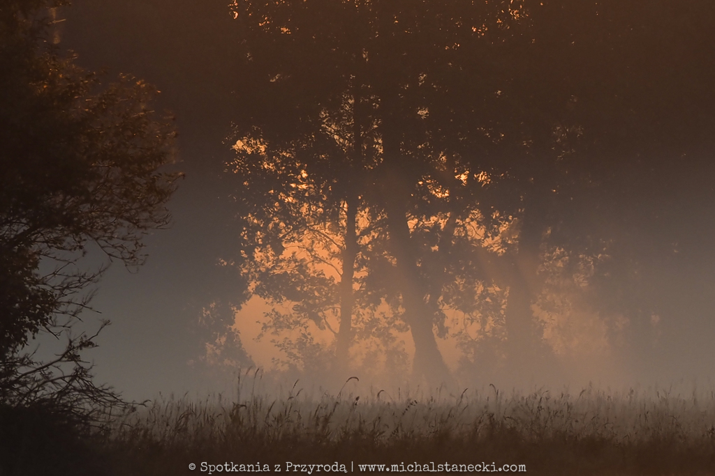Czekałem na pierwsze światło poranka. Długo przed wschodem słońca, za kolejnymi drzewami zaczęła się rozjaśniać pozioma linia prześwitu. Dominujące czernie zaczęły przechodzić w szarości. Po kolejnych pokonanych metrach i minutach, które rozjaśniły mój punkt widzenia, zacząłem dostrzegać sylwetki jeleni chodzących po polu. Szedłem na wschód, czyli pod (nadal słabe) światło. Widząc zwierzęta poruszające się bardzo blisko granicy lasu zrozumiałem, że nie mam szans dojść do rowu. Nie da się tego zrobić bez zburzenia ich spokoju. Nie było nawet sensu próbować. Ryzyko spłoszenia jeleni było zbyt duże. Zburzenie magicznego klimatu tych chwil nie było warte żadnego zdjęcia.