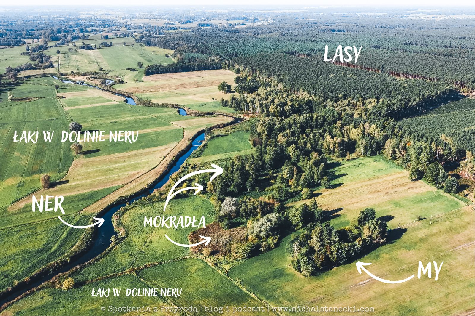 Z jednej strony (od północy) z działką sąsiadują duże lasy, głównie gospodarcze, ale z kilkoma „dzikimi” obszarami starszych, mieszanych drzewostanów. Z dwóch stron siedliska są koszone (w maju i sierpniu) łąki. Po południowej stronie, wśród tych łąk, meandruje Ner, którego na szczęście w tym rejonie nigdy nie uregulowano. W pobliżu czwartej granicy działki, łąka przechodzi w stare zadrzewienie i mokradła porośnięte wierzbami, trzcinami, turzycami i innymi odmianami traw lubiących podmokłe grunty.