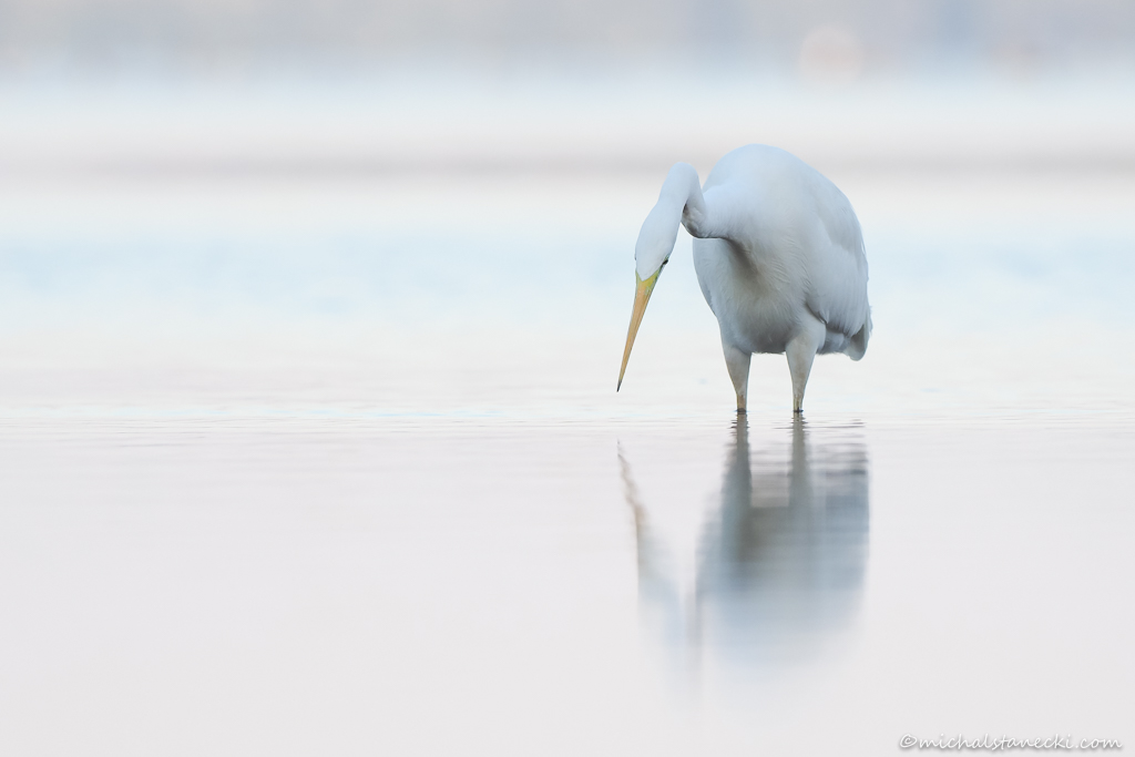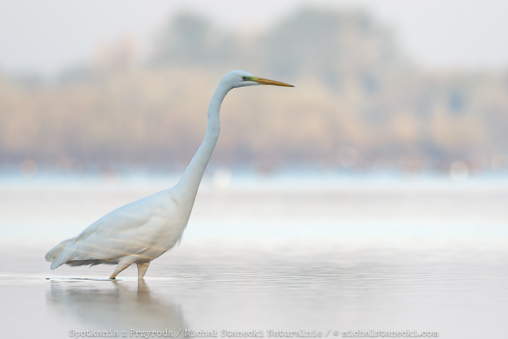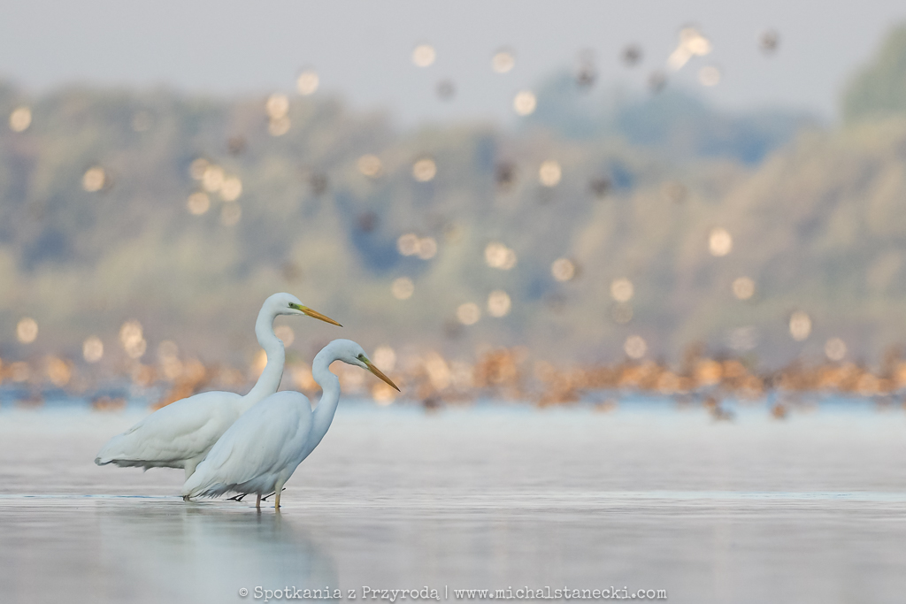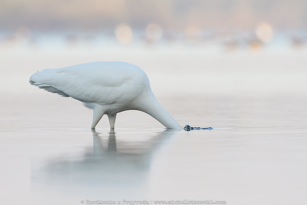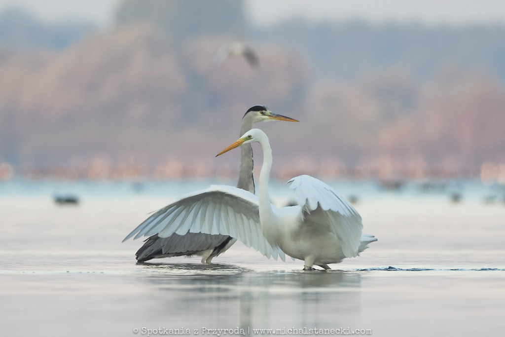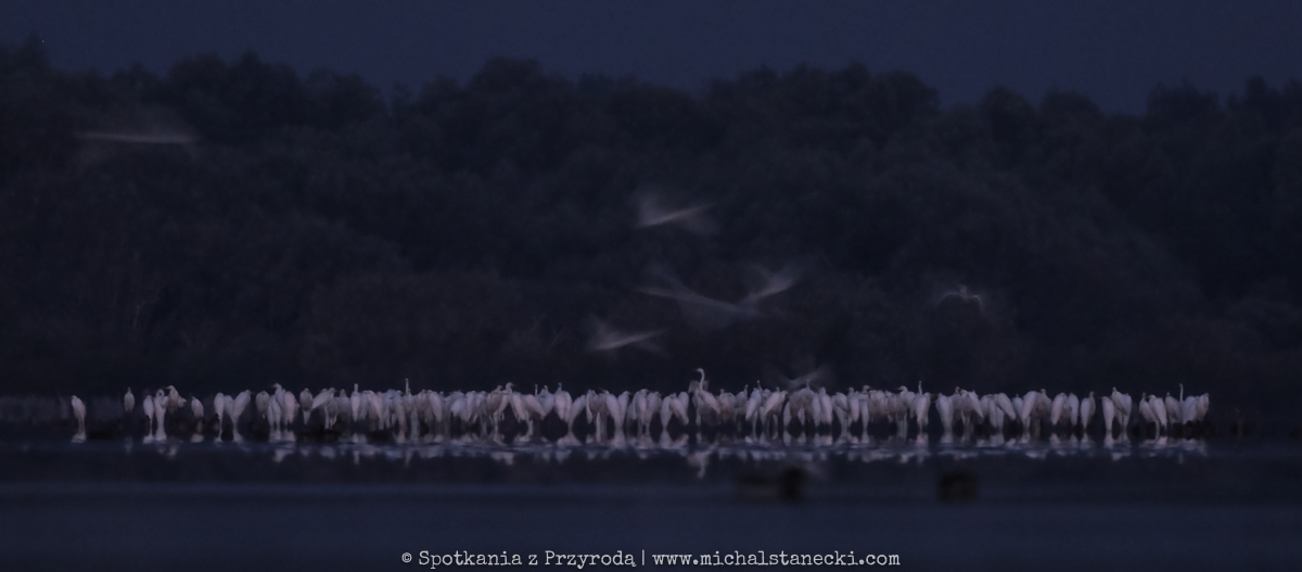Kolejny raz skorzystałem z utrzymujących się doskonałych warunków do obserwowania i fotografowania ptaków z bliska. Tradycyjnie już po ciemku ukryłem się na brzegu zbiornika. W ten chłodny poranek czekanie na czaple umilały dobiegające z oddali porykiwania jeleni. Ptaki przyleciały jeszcze przed świtem z miejscsa, w którym w dość licznej grupie nocowały. Podobnie jak poprzednio dominowały czaple białe, choć zjawiło się też kilka siwych. Poruszały się z gracją w płytkiej wodzie, paradując przed moim ukryciem. Czaple przyleciały w to miejsce w konkretnym celu – na ryby. I to właśnie wypatrywaniu i próbom (często skutecznym) chwytania ryb oddawały się kolejne dwie godziny. Można było w spokoju podziwiać ten niesamowity spektakl. Oto kilka kadrów będących efektem tej zasiadki.