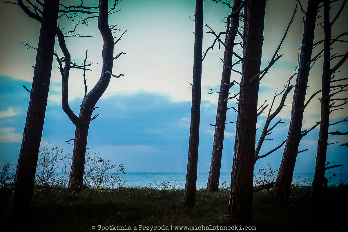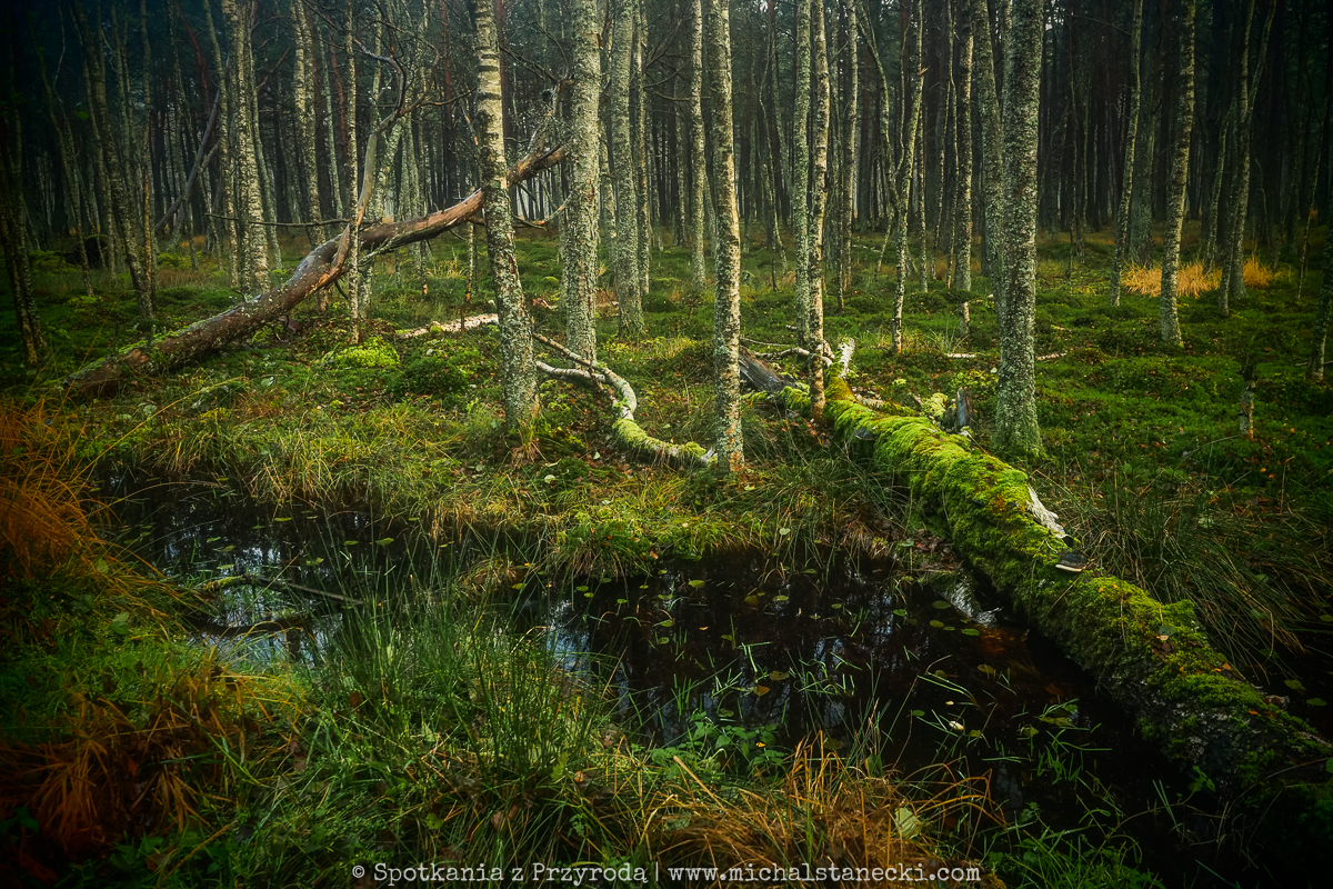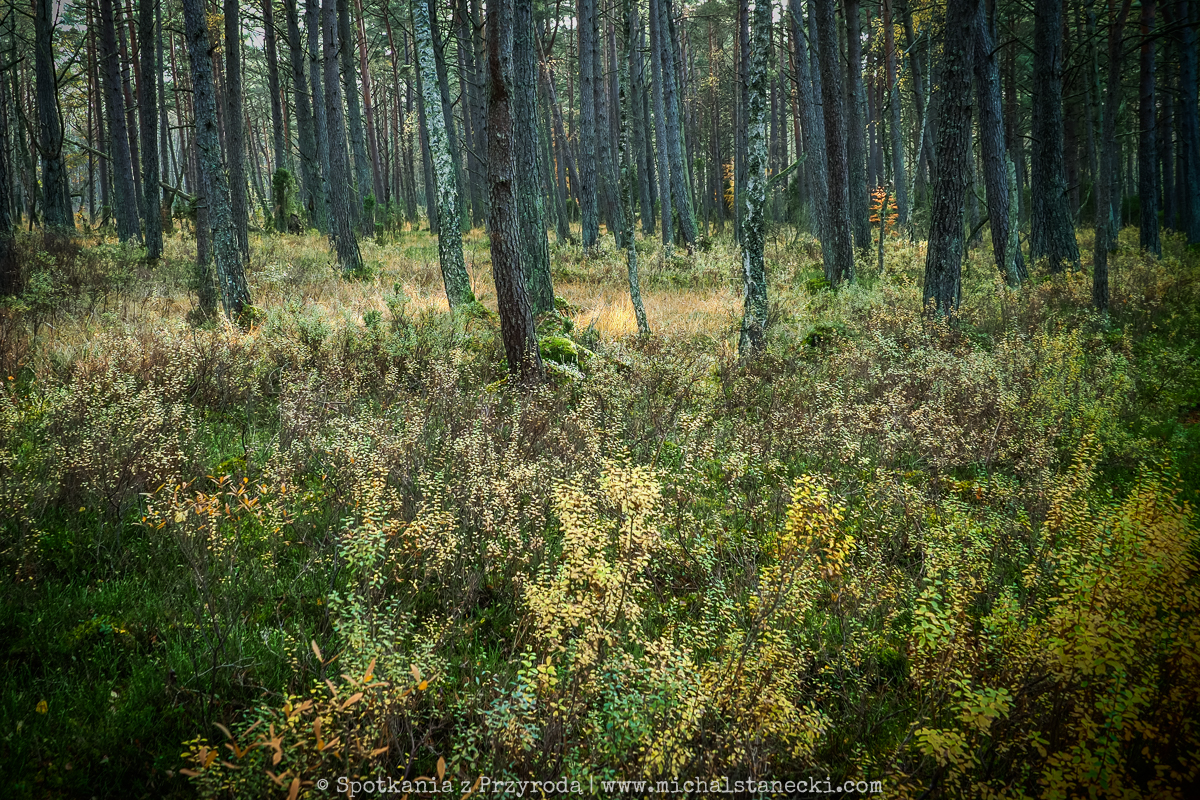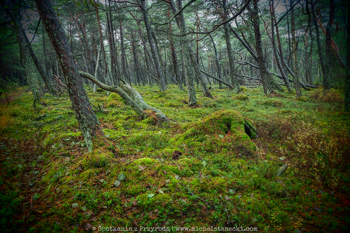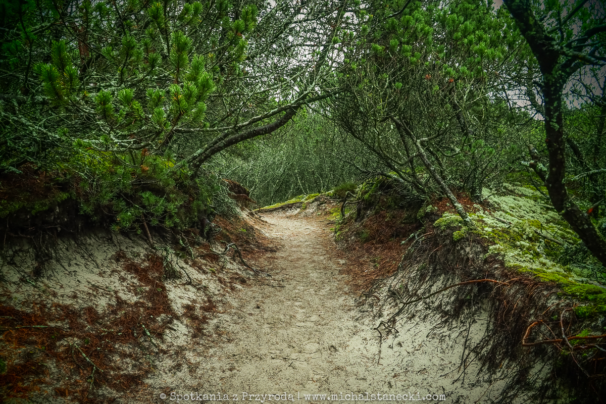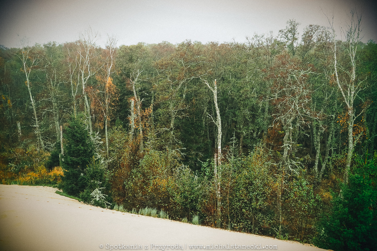 Słowiński Park Narodowy najczęściej kojarzony jest z ruchomymi wydmami. Choć są one uznawane za największą atrakcję Parku, to nas oczarowały lasy. Całodniowe wędrówki po parkowych szlakach pozwoliły nam zobaczyć lasy osadzone w zupełnie innych środowiskach. Suche (piaszczyste) bory sosnowe, karłowate sosenki rosnące szerokimi połaciami wzdłuż wybrzeża, bory bażynowe, torfowiska, i wreszcie zalane lasy, do pokonania których niezbędne były kalosze. Oczywiście SPN to także jeziora, typowe wydmy i plaże, ale nas zdecydowanie najbardziej urzekły wiecznie zielone iglaste lasy, które otulone jesiennym klimatem listopadowego chłodu i ciężkich chmur prezentowały się wyjątkowo.