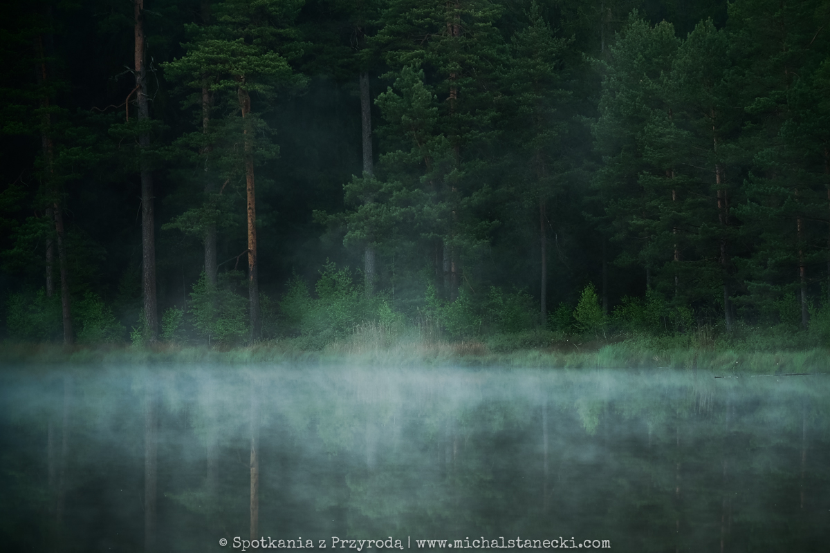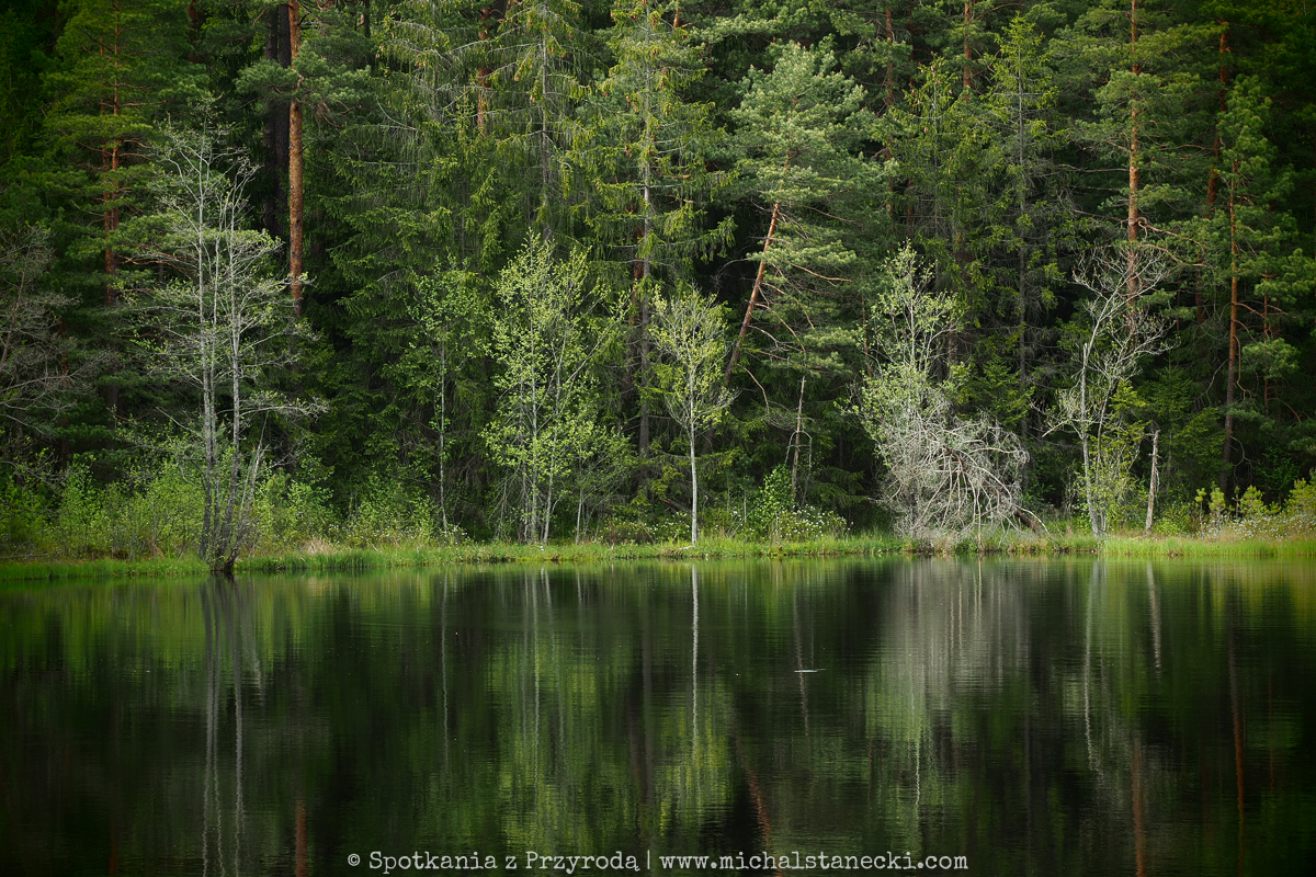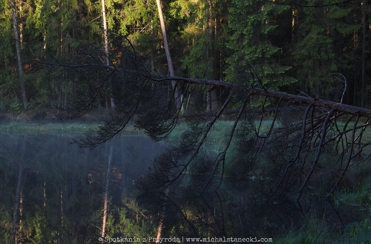 Maszerując po szlakach Wigierskiego Parku Narodowego podglądaliśmy przyrodę północno-wschodniej Polski. Ten rejon to głównie lasy i jeziora, choć nie brakuje też pofałdowanych krajobrazów przywodzących na myśl ich lodowcowe pochodzenie. Najbardziej oczarowały nas leśne jeziora. W kilku takich miejscach krajobraz przypominał obrazki widywane w Finlandii. Te jeziora to nieduże bagniste „suchary” otoczone grubym kożuchem pływającej roślinności. W oparach porannej mgły pływały tam gągoły i nurogęsi. Okoliczne bory przypominały skandynawską tajgę. Swoje uroki stopniowo odsłaniała też przed nami Czarna Hańcza, wyjątkowa rzeka, której miejscami bagnista dolina przecinała lasy tworząc niewiarygodnie piękne zakątki. Cisza, spokój i wrażenie „dzikości” tych wszystkich miejsc najbardziej urzekały o świcie…