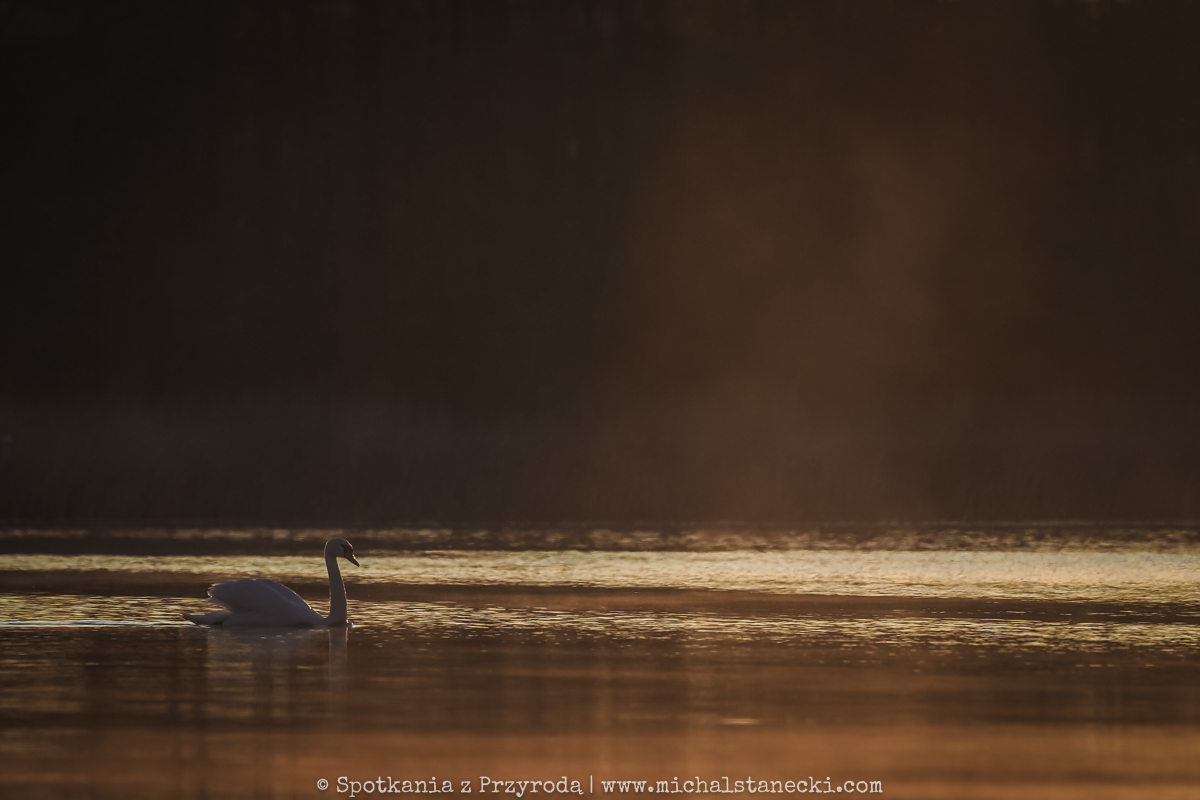 liczny mieszkaniec jezior – łabędź niemy o wschodzie słońca