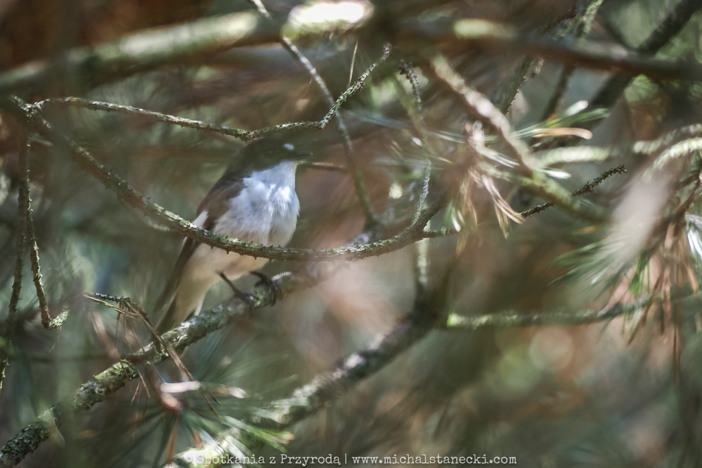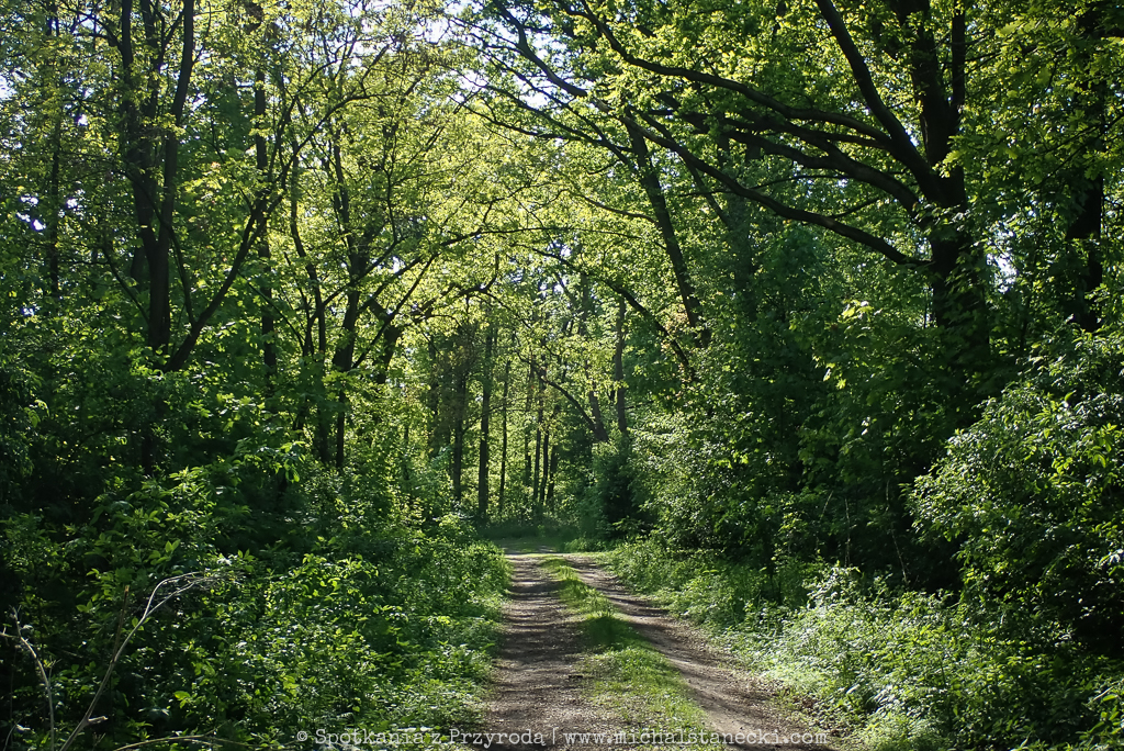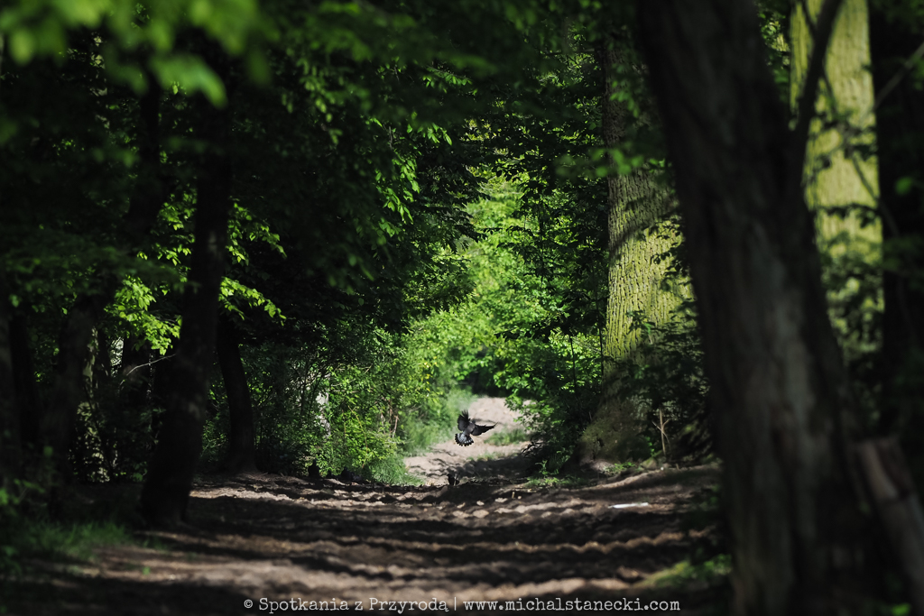 W tej ostoi zwierzyny (przez lata fotografowałem tam jelenie, daniele, sarny, dziki, lisy, zające, kuny, łasice, gryzonie i oczywiście ptaki) jest bardzo zielono i super gęsto. Przedzieramy się wzdłuż osi lasu. Największe atrakcje tego miejsca to możliwość posłuchania specyficznego, bardzo gadatliwego śpiewu zaganiacza (naszego pierwszego w tym roku) oraz wsłuchiwanie się w przyjemne, miękkie gruchanie turkawek. Te rzadkie u nas gołebie upodobały sobie gęste liściaste młodniki. Jeden z ptaków dla odmiany „nadawał” z wysokiego drzewa. Słychać również grubodzioby i świstunki leśne.