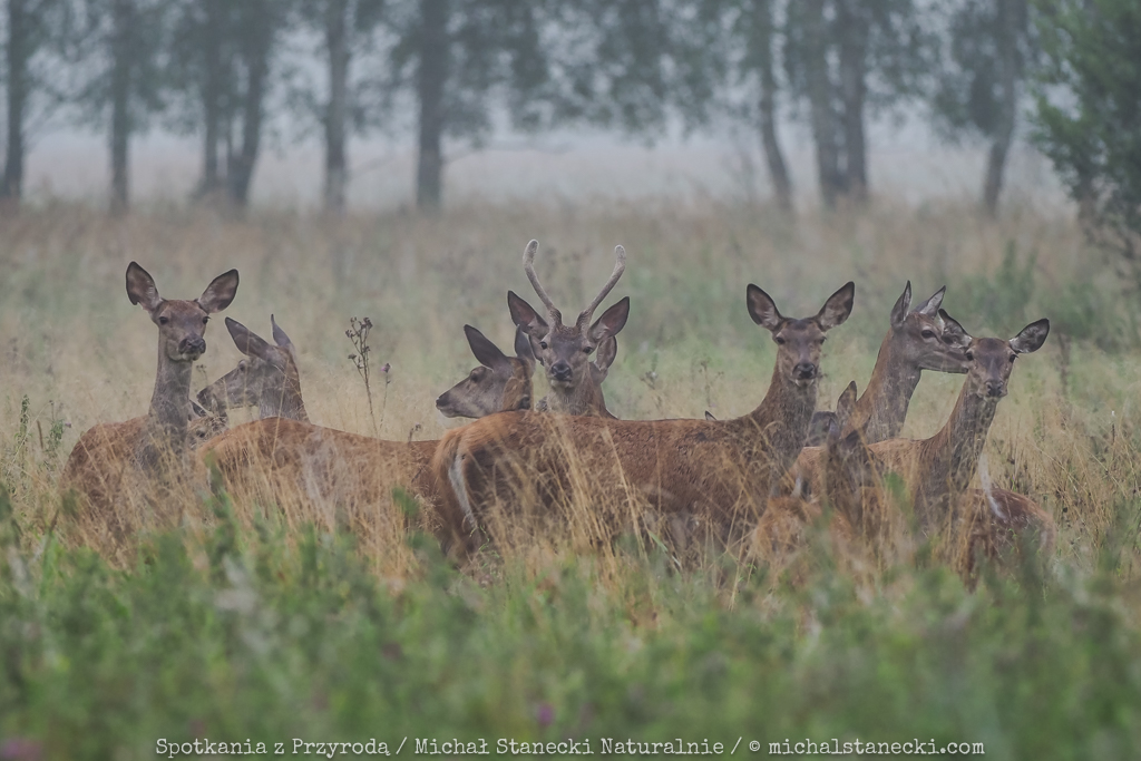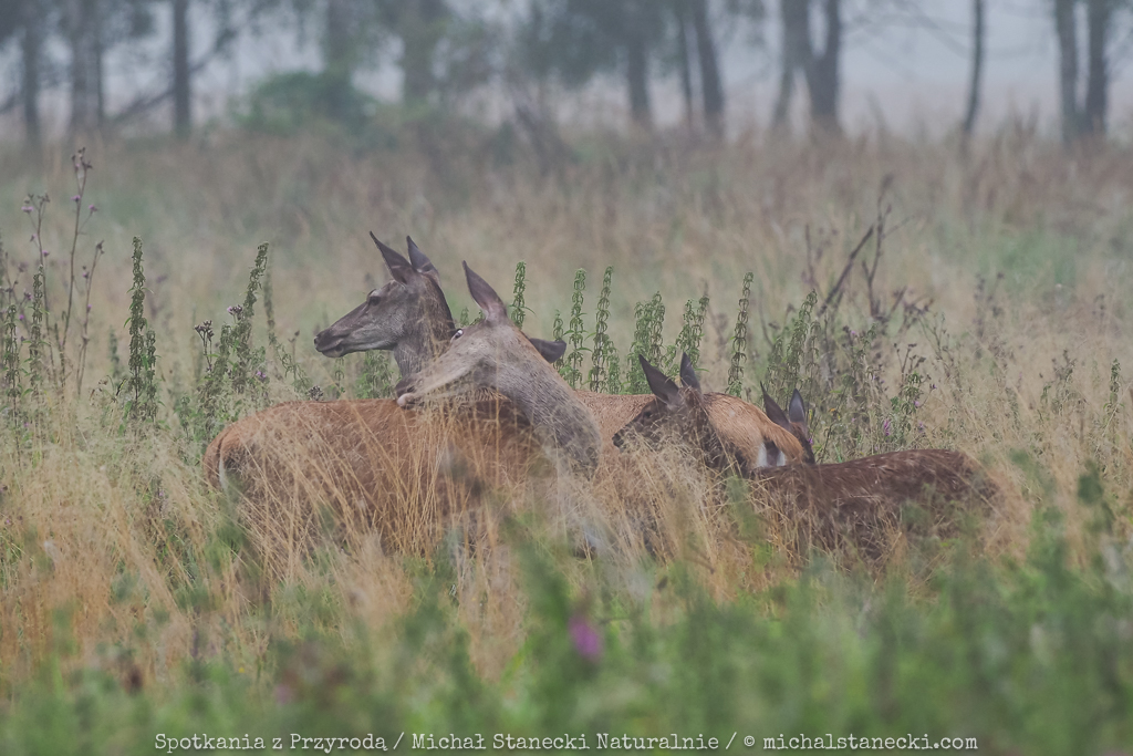 Odgłosy przechodzenia przez zarośla ewidentnie wskazują na bliską obecność kilku, może nawet kilkunastu dużych zwierząt. Po chwili na polanę wychodzi mała grupa składająca się z kilku łań z cielakami i jednego młodego byczka. Zwierzęta na moment się zatrzymują. Rozglądają się, zbierają w jednym miejscu pozwalając mi zrobić kilka kolejnych klatek. Po kolejnej chwili odchodzą dalej w stronę lasu. Kropi deszcz.