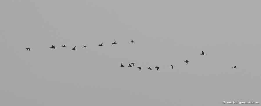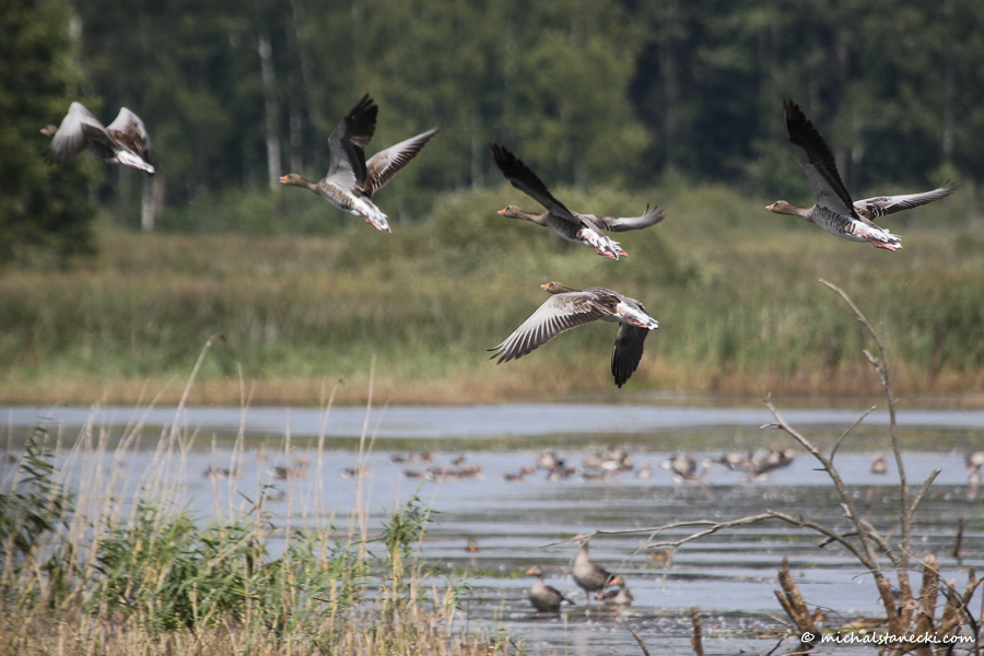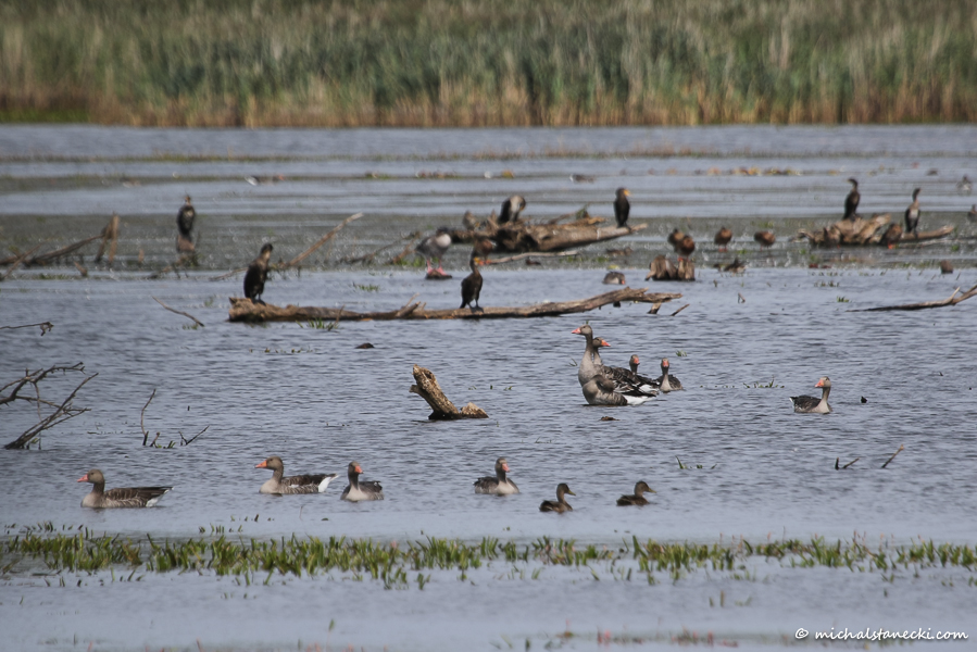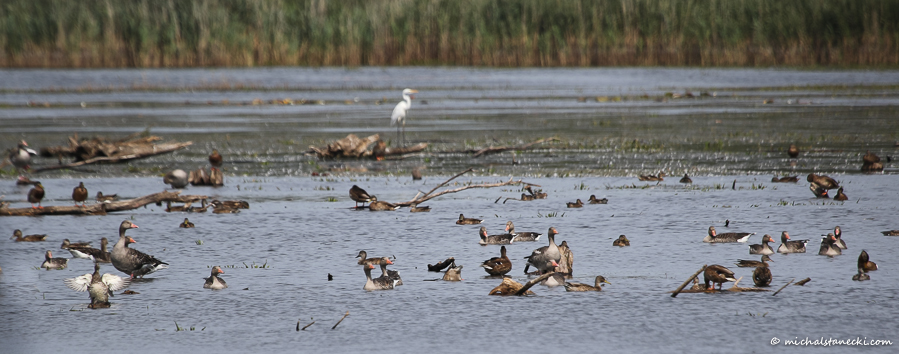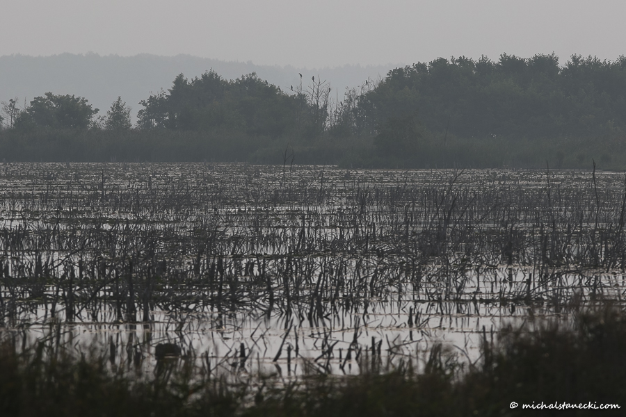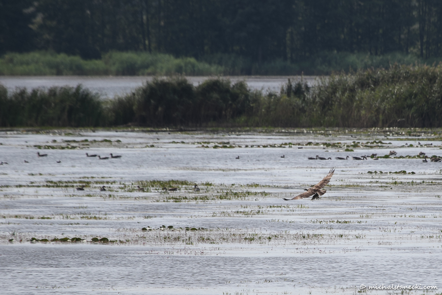 W Poleskim Parku Narodowym odwiedzamy kompleks „zdziczałych” stawów rybnych, przez który poprowadzona została ścieżka przyrodnicza „Perehod”. Z wieży obserwacyjnej mamy możliwość obserwowania dużego zgrupowania ptaków, zlokalizowanego na dużym płytkim stawie. Obecne są: gęgawy, kormorany, czaple siwe i białe, całe mnóstwo krzyżówek i łysek. Teren patrolowany jest przez błotniaki stawowe. Na łowy przylatują także rybołów i trochę później dwa bieliki.