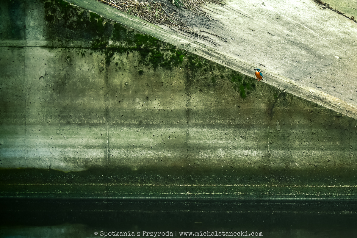 zimorodek wykorzystuje betonową konstrukcję przepustu jako czatownię