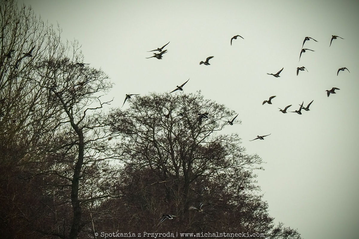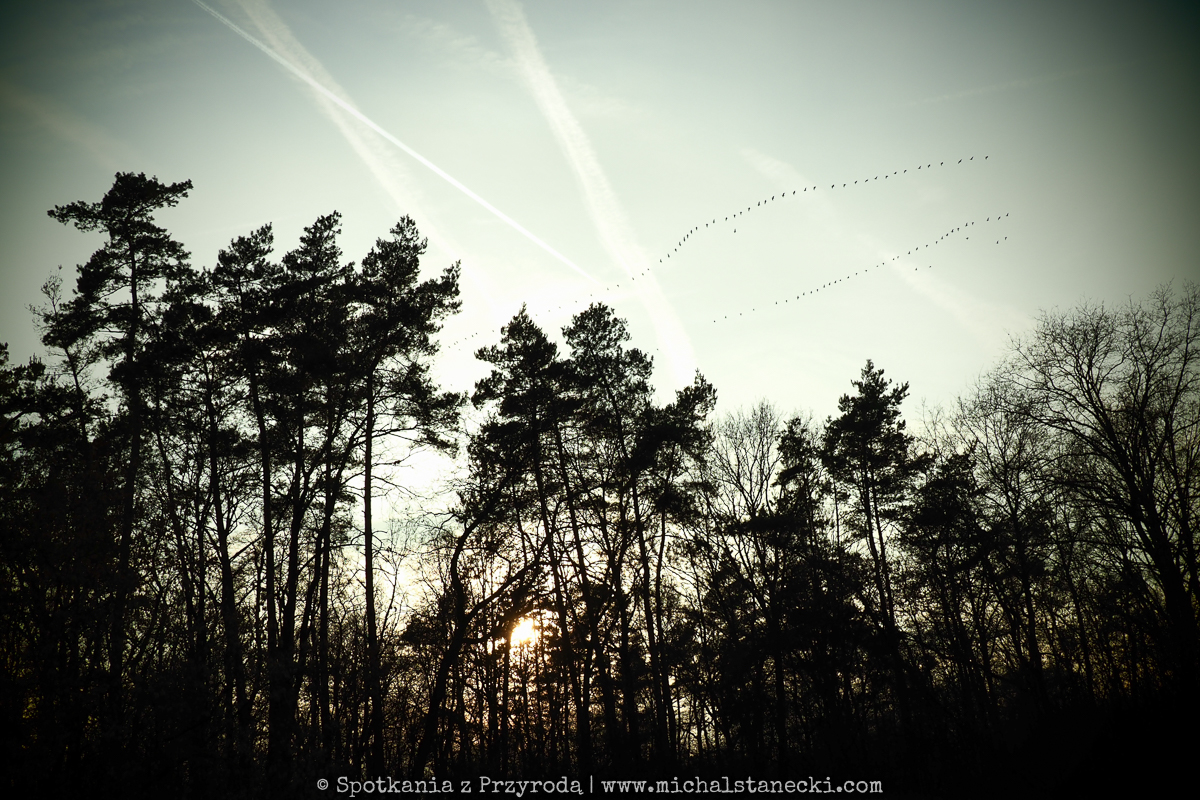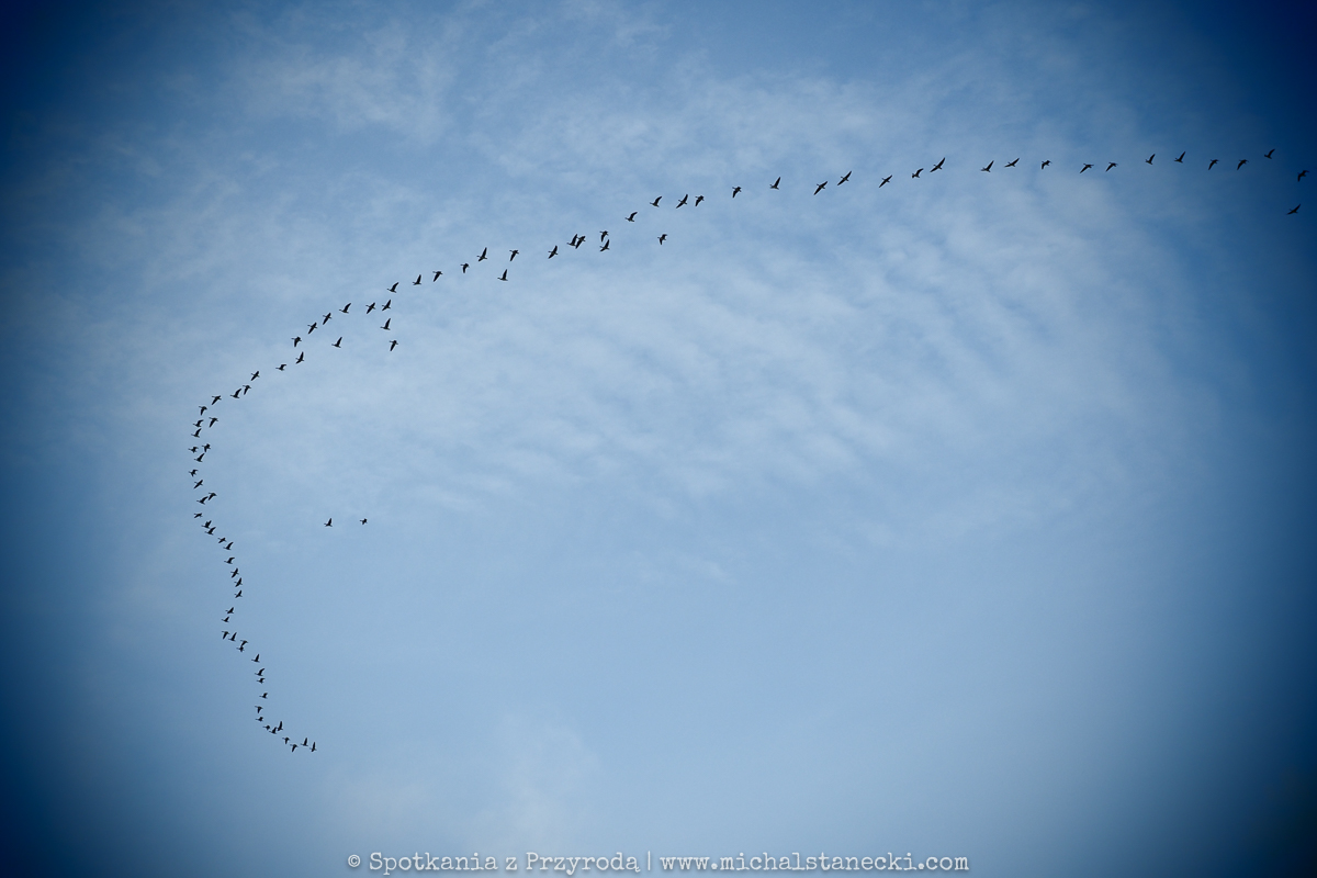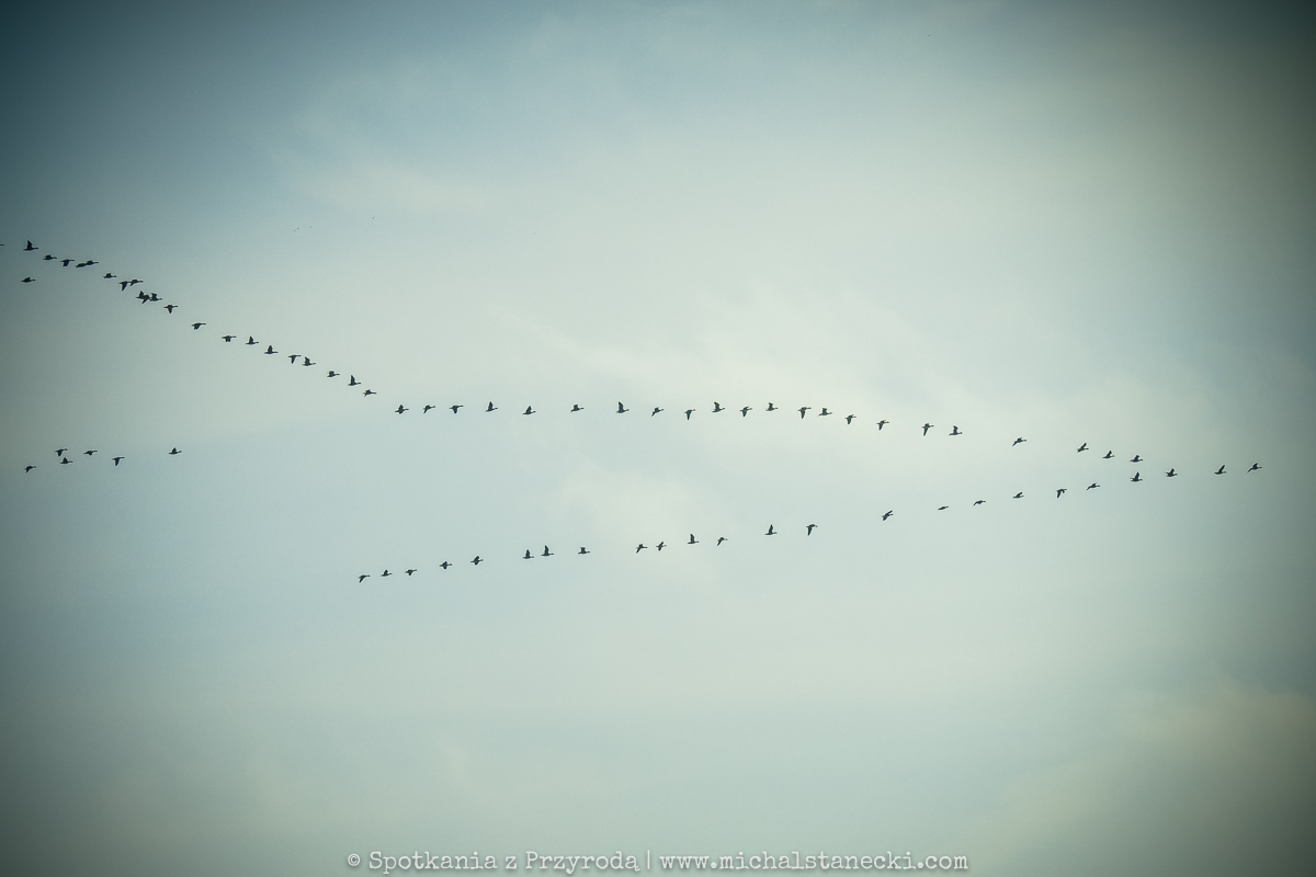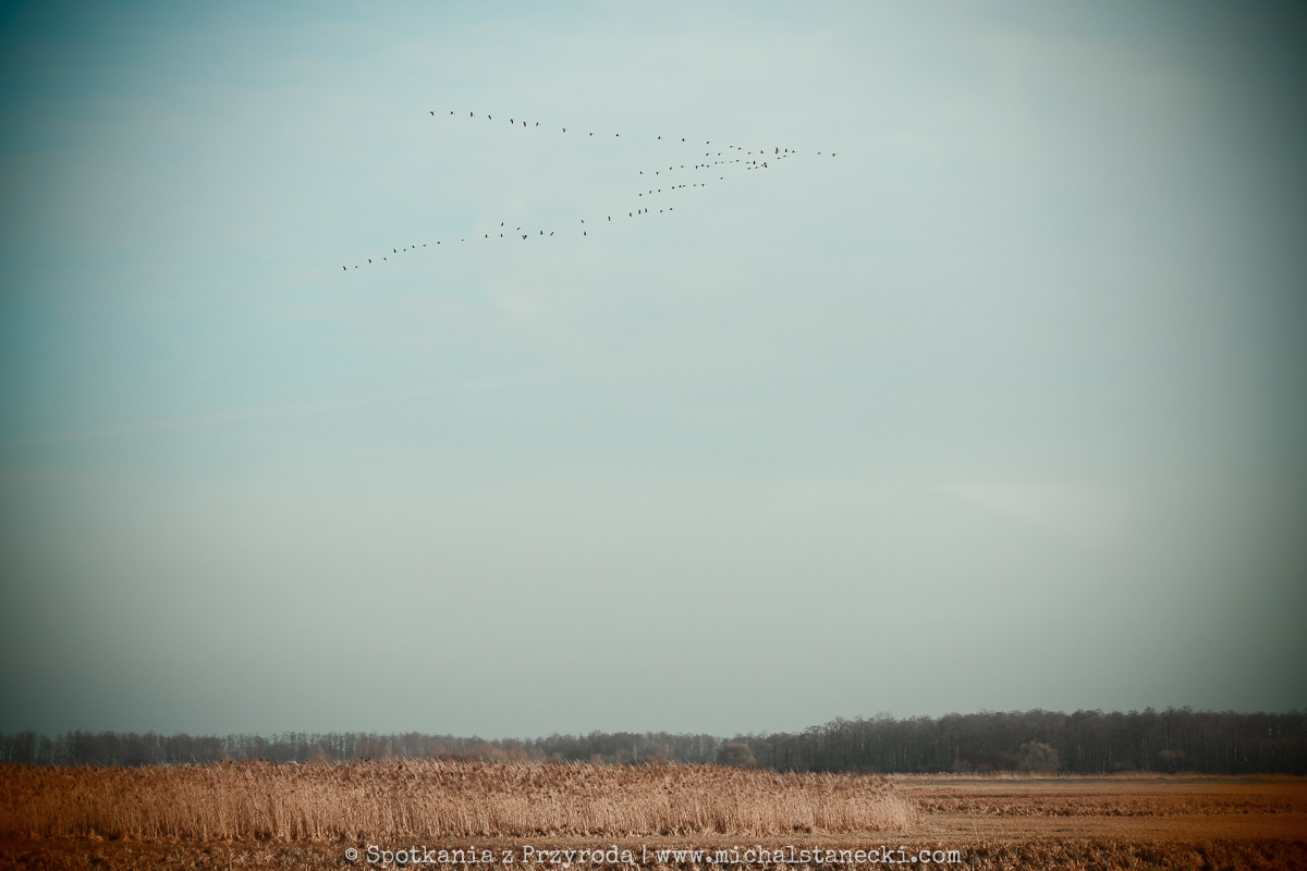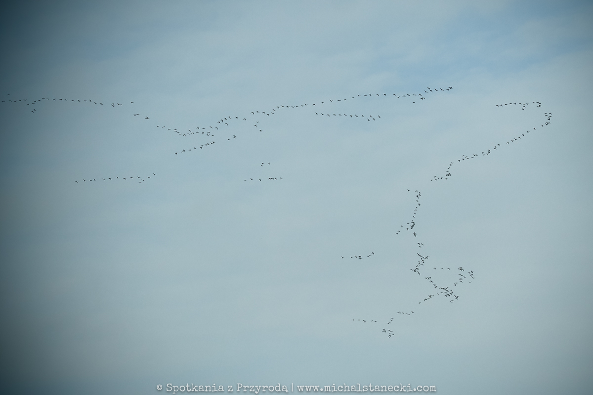 Tym razem pojechaliśmy sprawdzić, co słychać (i widać) w Dolinie Bzury. Podobnie jak w pozostałych dolinach rzek naszego województwa, widać tam i słychać głównie ciągnące gęsi. Duże stada sformowane w mniejsze, większe i ogromne klucze, z głośnym gęganiem przesuwają się po niebie.