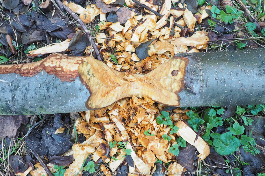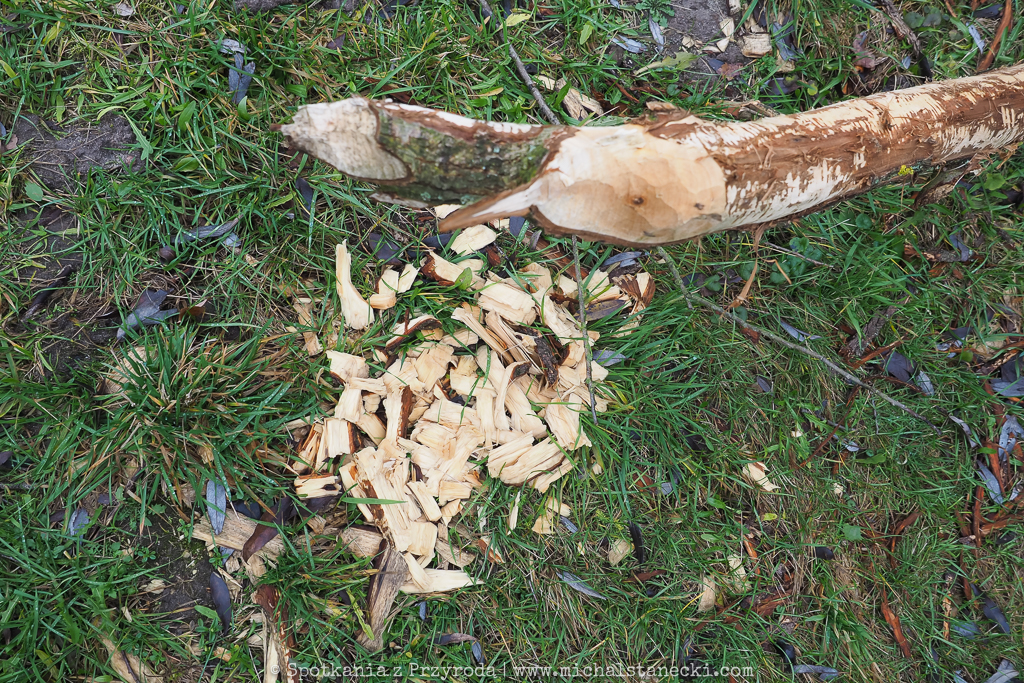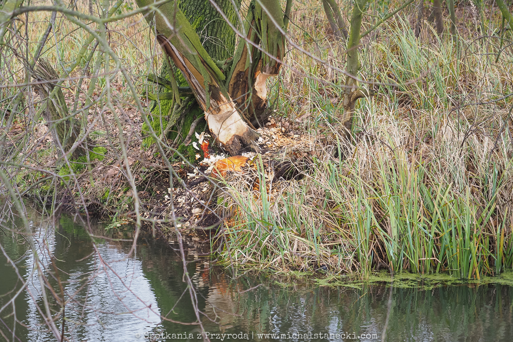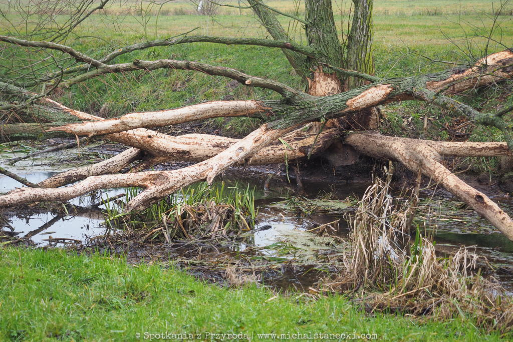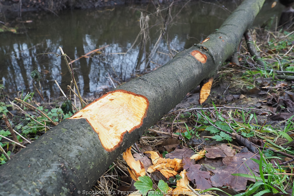 Na niewielkim dopływie Neru (na granicy lasu i łąki) przez kilka lat widać było ślady stałej obecności bobrów. Zwierzęta okresowo spiętrzały poziom wody w rzeczce i regularnie zgryzały kolejne drzewa. Gdy przy wyższym poziomie wody łąka była lekko zalewana, w sezonie wiosennym często pojawiały się na niej liczne bociany i żurawie. W ubiegłym roku, po serii radykalnych interwencji związanych z oczyszczaniem koryta rzeki przez ludzi wyposażonych w koparki, bobry się wyniosły. Gdy kilka dni temu odwiedziłem to miejsce znów zobaczyłem leżące, stosunkowo niedawno poobgryzane drzewa. Oznacza to, że te duże ziemnowodne gryzonie powróciły w miejsce, które z różnych względów tak bardzo im odpowiada. Choć samego bobra, przynajmniej w ciągu dnia, zobaczyć jest dość trudno, to ślady jego obecności już z daleka rzucają się w oczy. Przewalone drzewa, poodcinane od pni konary i gałęzie, zgryziona kora i łyko, pełno wiórów (zgryzów) dookoła i wreszcie tamy na rzece nie pozostawiają żadnych wątpliwości, kto taki zadomowił się w okolicy. Warto w takie miejsce udać się (koniecznie w absolutnej ciszy) przed świtem lub zmrokiem, bo wtedy znacznie wzrasta szansa na zobaczenie tych niesamowitych zwierząt w akcji. Ważne, że rzeczka znów zaczyna wyglądać jak naturalny ciek wodny, a nie prostowany na siłę i oczyszczony sztucznie rów z wodą. W dobie wszechobecnej melioracji takich miejsc jest niestety coraz mniej. Ciekawe tylko, jak długo tym razem cierpliwi będą miejscowi gospodarze…