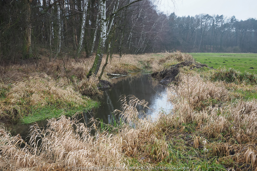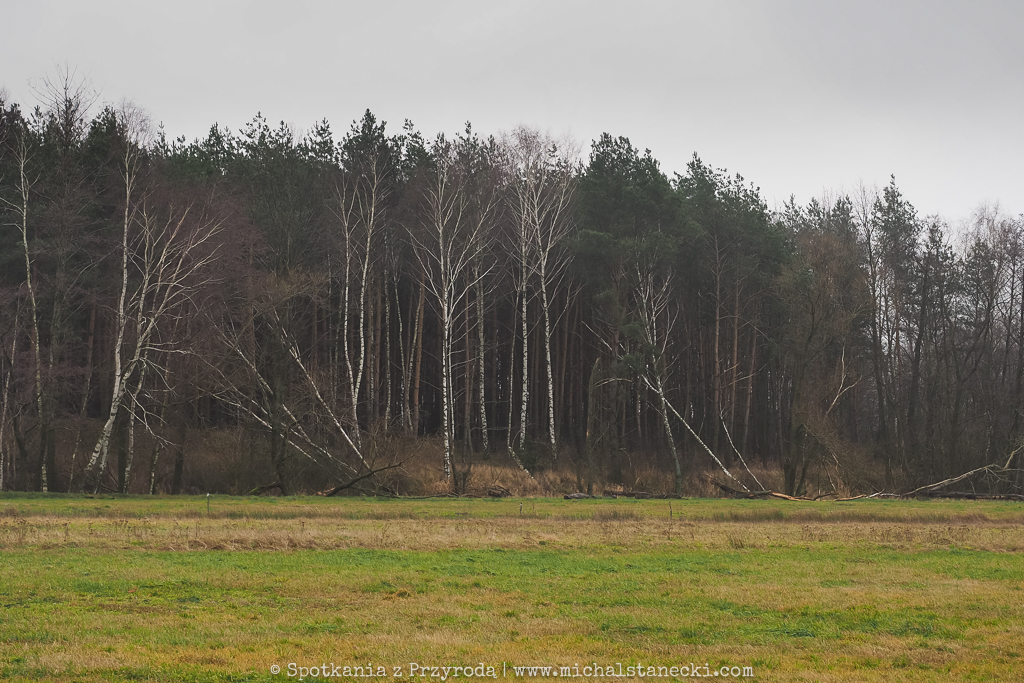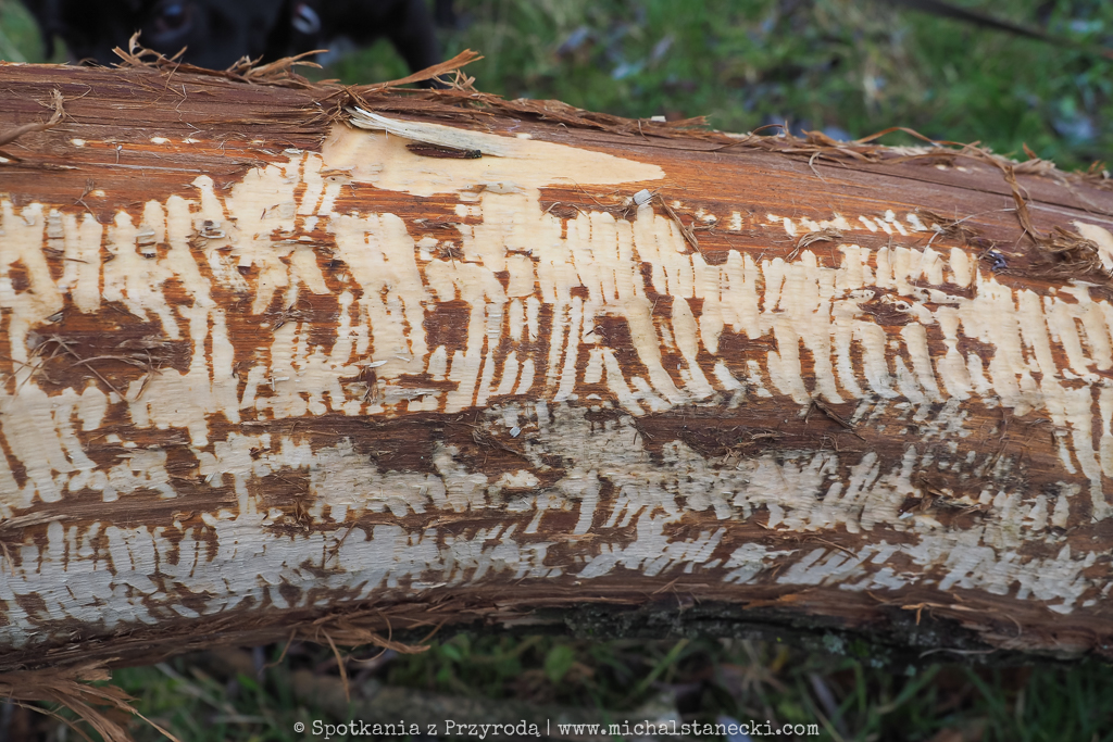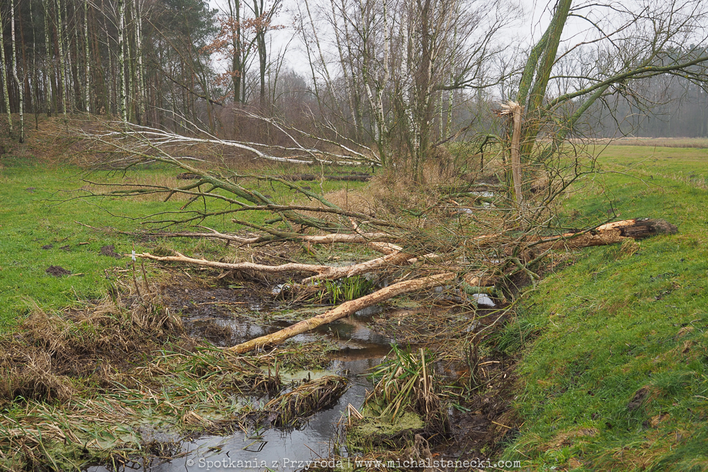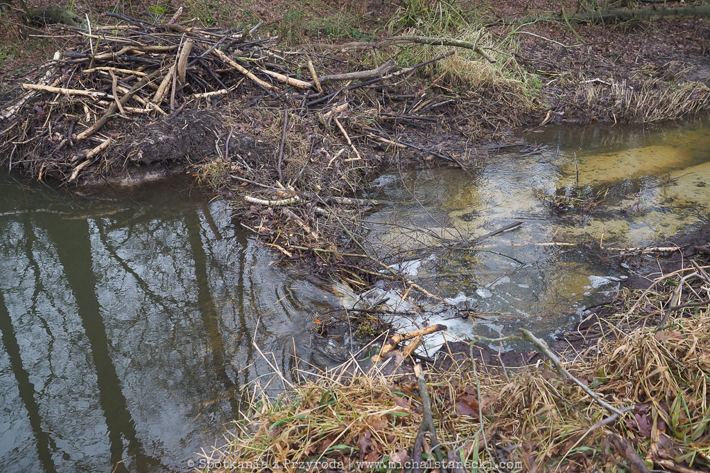 Na niewielkim dopływie Neru (na granicy lasu i łąki) przez kilka lat widać było ślady stałej obecności bobrów. Zwierzęta okresowo spiętrzały poziom wody w rzeczce i regularnie zgryzały kolejne drzewa. Gdy przy wyższym poziomie wody łąka była lekko zalewana, w sezonie wiosennym często pojawiały się na niej liczne bociany i żurawie. W ubiegłym roku, po serii radykalnych interwencji związanych z oczyszczaniem koryta rzeki przez ludzi wyposażonych w koparki, bobry się wyniosły. Gdy kilka dni temu odwiedziłem to miejsce znów zobaczyłem leżące, stosunkowo niedawno poobgryzane drzewa. Oznacza to, że te duże ziemnowodne gryzonie powróciły w miejsce, które z różnych względów tak bardzo im odpowiada. Choć samego bobra, przynajmniej w ciągu dnia, zobaczyć jest dość trudno, to ślady jego obecności już z daleka rzucają się w oczy. Przewalone drzewa, poodcinane od pni konary i gałęzie, zgryziona kora i łyko, pełno wiórów (zgryzów) dookoła i wreszcie tamy na rzece nie pozostawiają żadnych wątpliwości, kto taki zadomowił się w okolicy. Warto w takie miejsce udać się (koniecznie w absolutnej ciszy) przed świtem lub zmrokiem, bo wtedy znacznie wzrasta szansa na zobaczenie tych niesamowitych zwierząt w akcji. Ważne, że rzeczka znów zaczyna wyglądać jak naturalny ciek wodny, a nie prostowany na siłę i oczyszczony sztucznie rów z wodą. W dobie wszechobecnej melioracji takich miejsc jest niestety coraz mniej. Ciekawe tylko, jak długo tym razem cierpliwi będą miejscowi gospodarze…