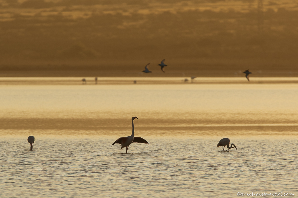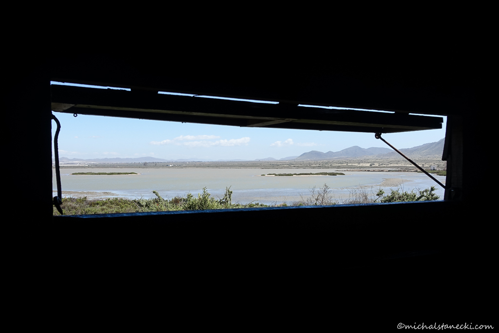 To właśnie ta laguna (Las Salinas) jest pierwszym celem naszej podróży. Jeszcze przed świtem, zaopatrzony w lornetkę, lunetę i aparat, maszeruję z miasteczka w stronę niewidocznych jeszcze czatowni obserwacyjnych, o których istnieniu wcześniej czytałem. Od strony morza widać i słychać mewy, na mijanych krzewach co chwilę przysiadają śpiewające dzierlatki, przy ostatnich zabudowaniach mnóstwo wróbli i szpaków jednobarwnych. Idąc piaszczystą drogą dochodzę do pierwszej czatowni. Zza gór powoli wychodzi słońce. Niebo jest pomarańczowe. Czatownia ustawiona jest kilkadziesiąt metrów od laguny, na której już gołym okiem widać mnóstwo jasnych punktów. Te największe z nich to flamingi, ptaki których nigdy wcześniej nie widziałem. Charakterystyczne sylwetki przemieszczają się powoli, dziobami filtrując wodę.