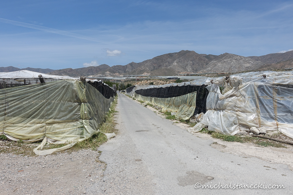 widok na „plasticos”, czyli tanie foliowe „szklarnie”, które w tym rejonie ciągną się po horyzont, rejon ten nazywany jest szklarnią Europy, owoce i warzywa uprawia się tu przez cały rok