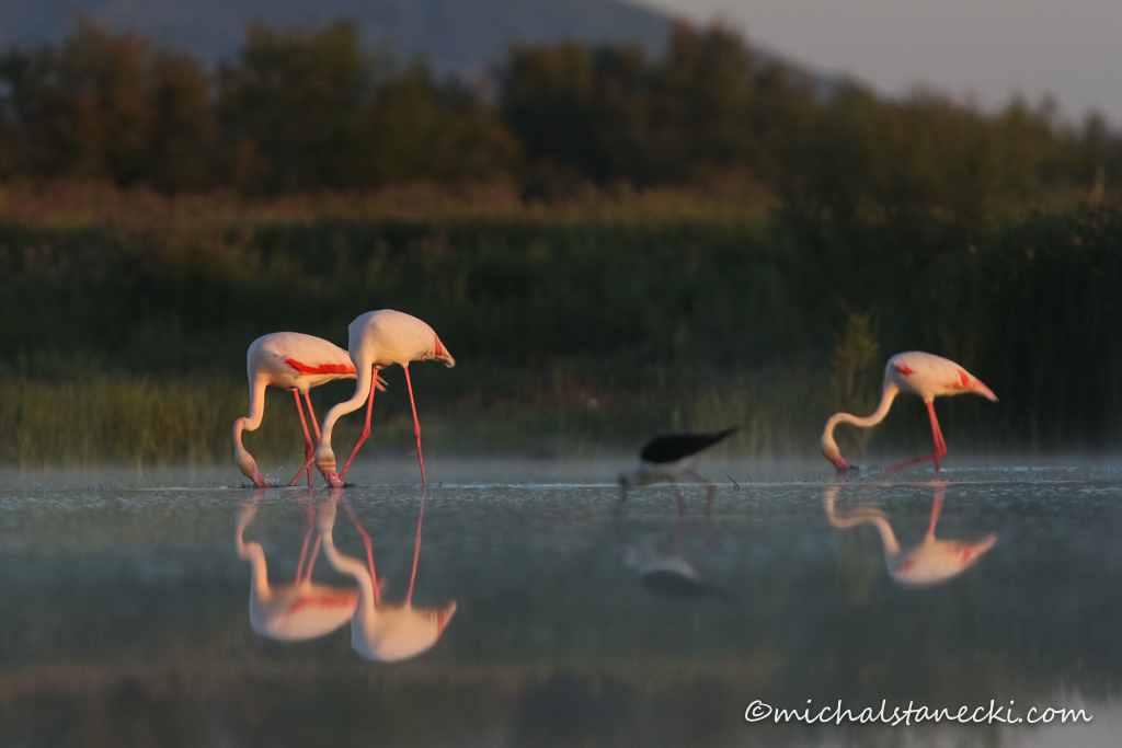 Przed wschodem słońca jestem już „zainstalowany” przy brzegu niedużego jeziorka. Fotografuję flamingi majestatycznie kroczące wzdłuż przeciwległego brzegu. Lekka mgiełka i pierwsze kolory wschodu słońca dodają tym scenom magii. Po sesji obejmującej również szczudłaki, szablodzioby i siewkowce, idę dalej w stronę właściwej (dużej) laguny. Wchodzę na teren należący do Centrum im. Valverde, zarządzającego rezerwatem. Poza głównym budynkiem, na terenie znajdują się również kilka czatowni obserwacyjnych ustawionych nad brzegami dwóch jezior (małego i większego). Czatownie wykonane zostały w sposób bardzo profesjonalny. Dojścia i wejścia do ich wnętrza zostały osłonięte trzcinowymi płotkami, znacznie ograniczając ryzyko spłoszenia ptaków. Na jeziorach oczywiście flamingi, liczne hełmiatki, płaskonosy, głowienki, łyski, perkozy dwuczube, czaple siwe i białe oraz ślepowrony. Na drzewach słowiki rdzawe, pokrzewki aksamitne. Pomiędzy krzewami śmigają bardzo liczne króliki, a na szutrowych dróżkach wygrzewają się w słońcu jaszczurki, w tym wielkie jaszczurki perłowe.