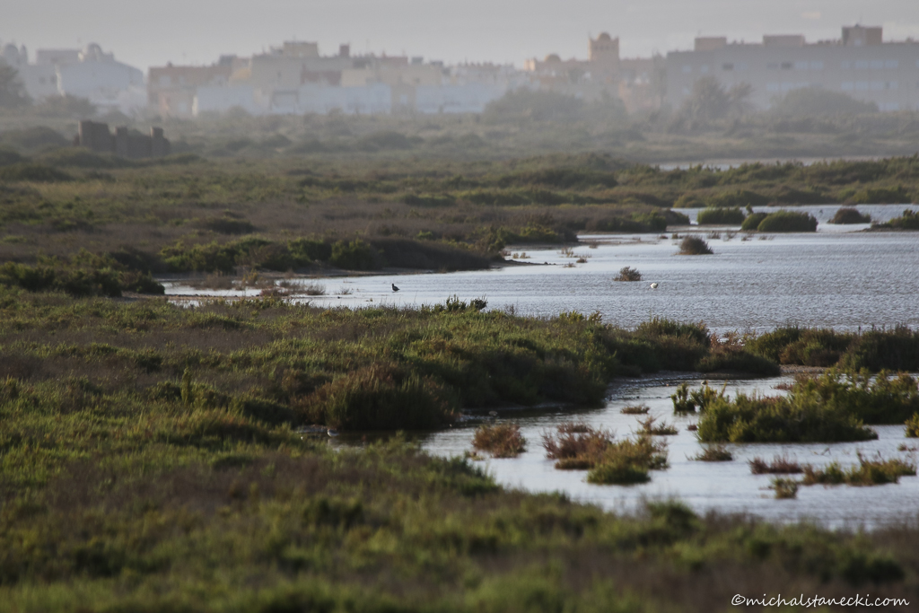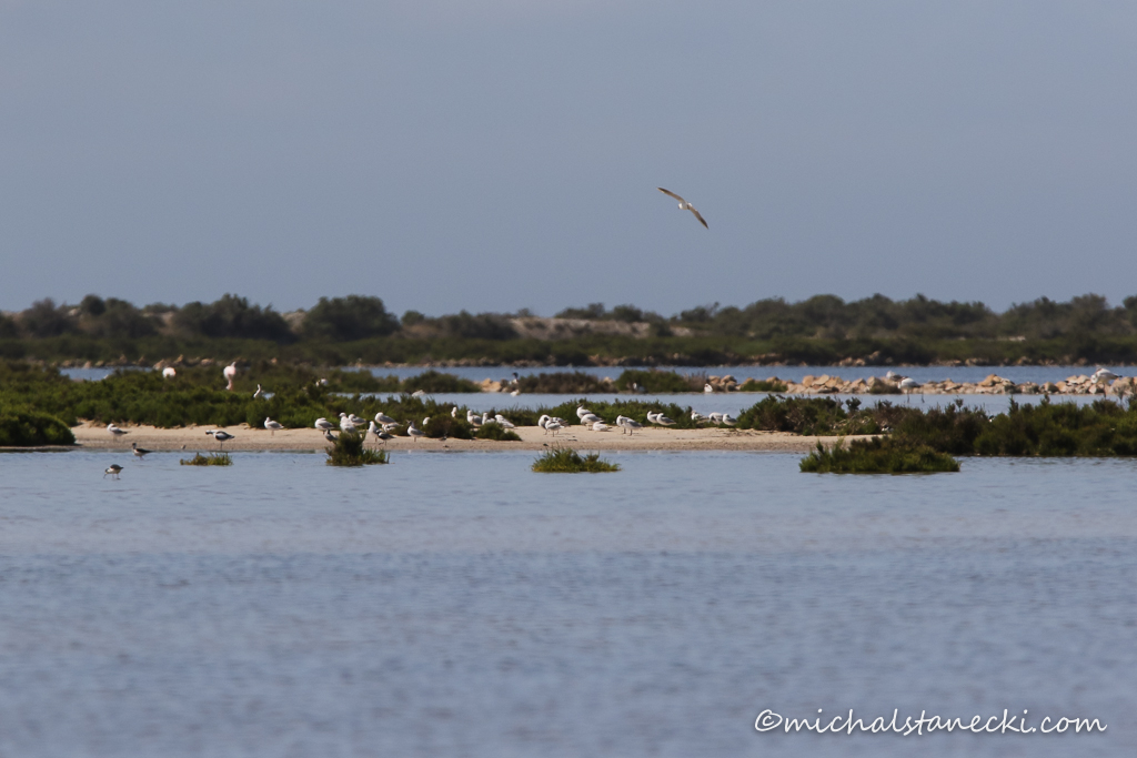 Na wodzie widać też liczne szablodzioby. Po przeczesaniu terenu, do listy obserwacji dopisuję: warzęchę, rybitwy, mewy cienkodziobe, czaple siwe, szczudłaki, sieweczki obrożne i morskie, ostrygojada, biegusy krzywodziobe, malutkie, zmienne, krwawodzioby, brodźce śniade i ohary. Na otaczających lagunę niskich krzewach pokazują się białorzytki, pokrzewki aksamitne i pliszki żółte. W powietrzu wiszą również pustułki.