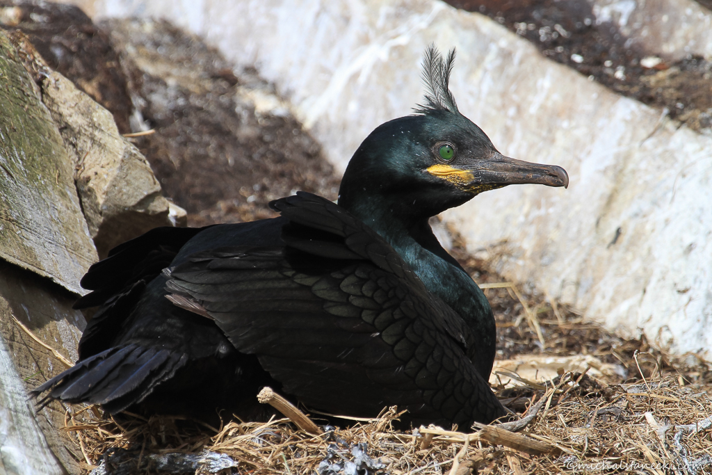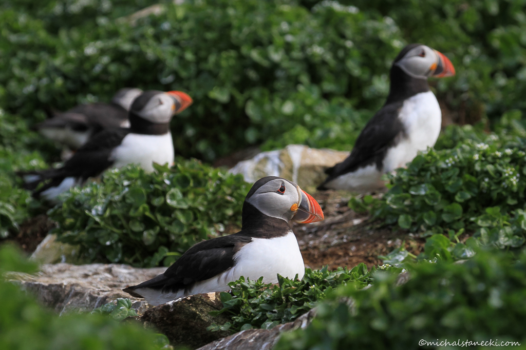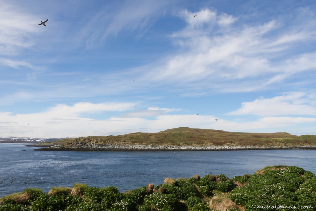 Ogromną ptasią kolonię rejestrujemy wszystkimi zmysłami. Z każdej strony docierają do nas odgłosy ptaków generujących spory hałas. Powietrze przesycone jest zapachem ptasich odchodów i choć to niby nic przyjemnego, dopełnia również wyjątkowości tego miejsca. Na zarośniętych zielonych półkach skalnych, kilkanaście metrów przed nami widać przebywające w pobliżu swych nor maskonury. Na gniazdach siedzą kormorany. Kilkadziesiąt metrów dalej cała stroma ściana należy do hałasujących mew trójpalczastych, których na wyspie jest najwięcej.