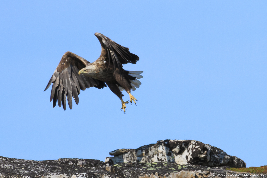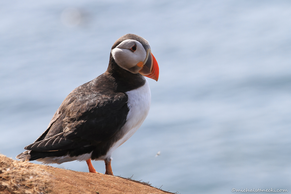 Dosłownie co chwilę nad głową przelatują startujące z klifu lub wracające od strony morza ptaki. W momencie gdy przelatują naprawdę blisko słychać świst powietrza. W tym miejscu dominują maskonury. Są bardzo szybkie. Błyskawiczny przelot i jakby chaotyczne lądowanie. Zaczynam fotografować. Jakby na zamówienie spod chmury wychodzi słońce. Aby zwiększyć swoje szanse na dobre klatki, zdjęcia nadlatujących ptaków wykonuję seriami.