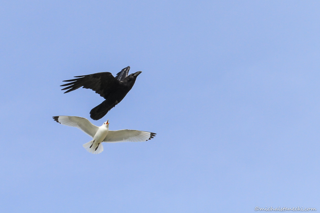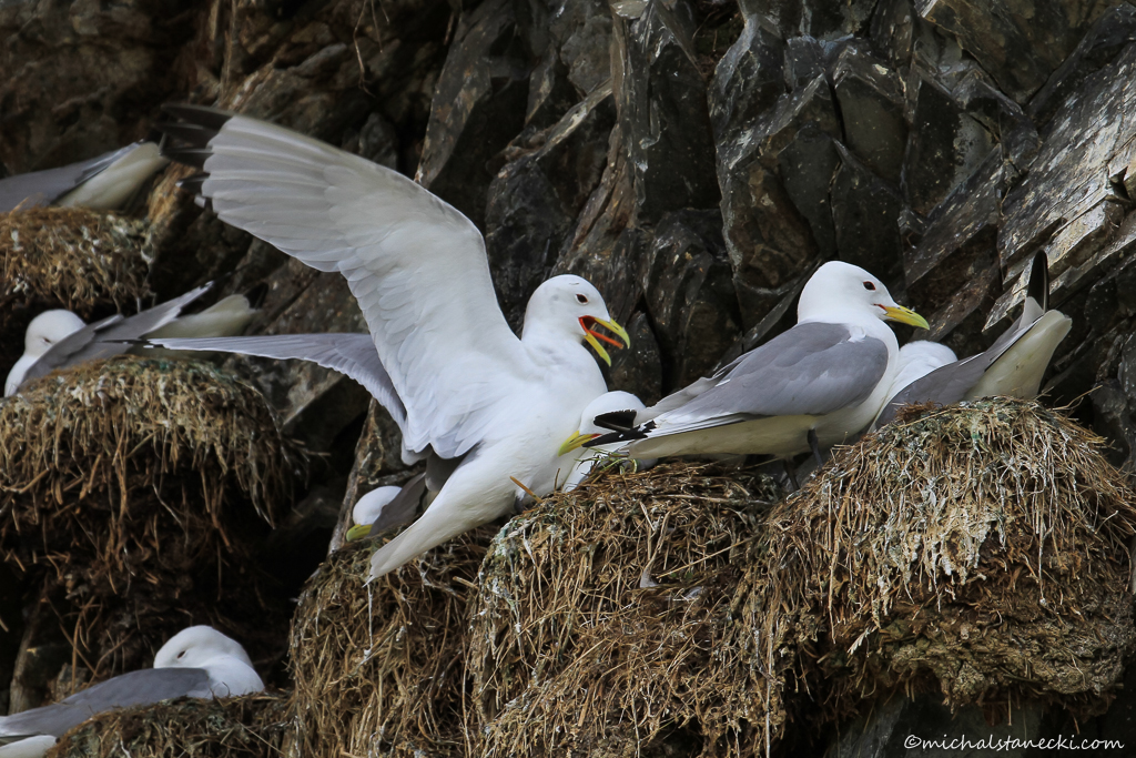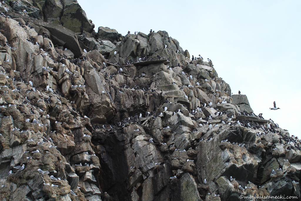 Czas do powrotu łodzi zaczyna szybko umykać. Podchodzę w stronę dużego zgrupowania mew trójpalczastych. Gdzieś wysoko na skale rozlega się nagły wrzask setek ptaków. Nad kolonią pojawiły się dwa kruki. W asyście mew, drapieżcy przelatują raz i drugi wzdłuż klifu.