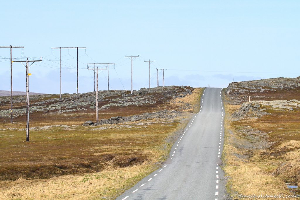 Starej osady opuszczonej przez rybaków jakieś 40 lat temu. Hamninberg to prawdziwy „Koniec Świata”. Kończy się tam europejska sieć dróg. Dalej jechać się nie da. Gdy rano pakujemy się do samochodu (do przejechania mamy jakieś 40 km) uderza w nas z dużą siłą porywisty arktyczny wiatr. Jest zimno. W nocy temperatura spadła do 2 stopni powyżej zera. Obowiązkowym wyposażeniem tego dnia stają się kurtki, polary, zimowe czapki i rękawiczki. Pokonujemy podmorski tunel i będąc już na półwyspie skręcamy w prawo (kierujemy się na północ). Po kilku minutach wyjeżdżamy z cywilizacji i wkraczamy w dziewiczy świat przyrody przecięty jedynie cieniutką wstążką szosy.