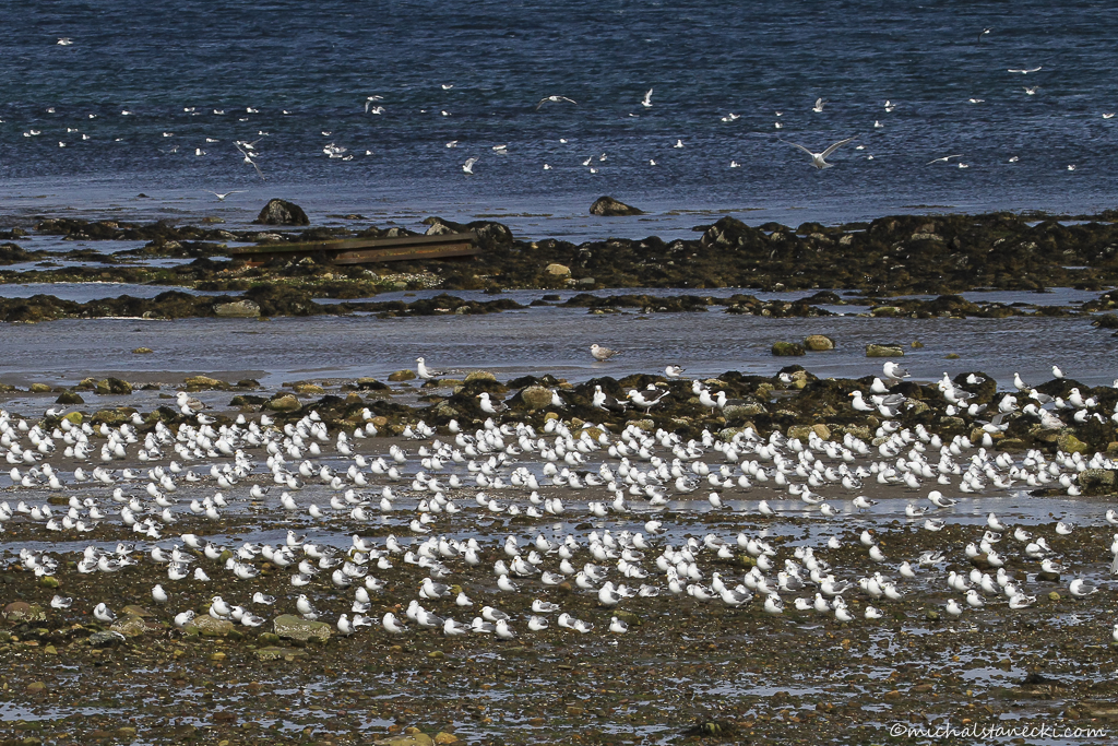 Stąd mam już niedaleko do drogi. Gdy wreszcie do niej dochodzę, telefonicznie „wzywam” transport. Gdy jestem już na „naszej” wyspie, uświadamiam sobie, że kilkugodzinny spacer z dość ciężkim plecakiem wcale nie pozbawił mnie sił. W związku tym nie zahaczając o kwaterę idę prosto na kamienisty brzeg wyspy. Z daleka widzę na nim duże zgrupowanie ptaków – głównie mew i rybitw. Na brzegu morza fotografuję do godziny 23:00.