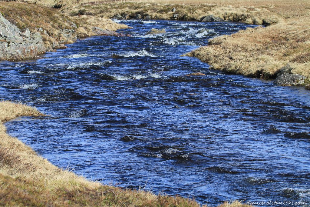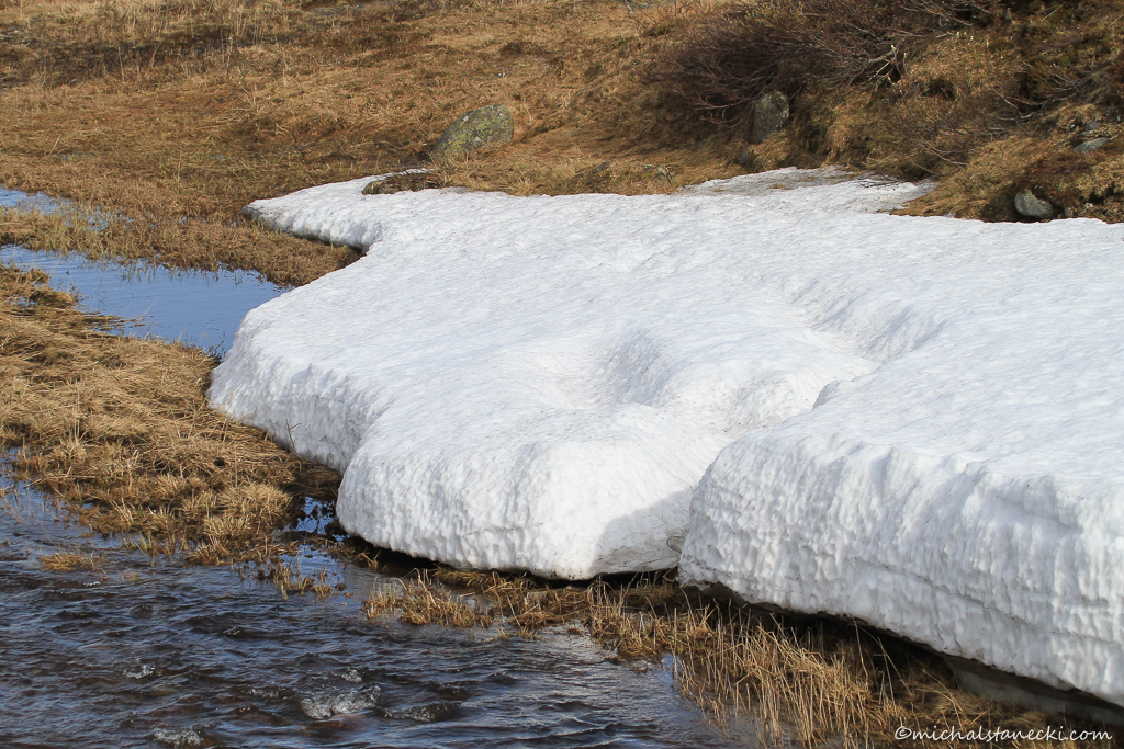 Decyduję o odwrocie. Po grubej warstwie śniegu dochodzę do miejsca, w którym rzeka o atramentowym kolorze wody wypływa spod śniegu niczym spod poprzecinanego szczelinami lodowca. Robię kilka zdjęć i rozpocząłem schodzenie w dół. Po drodze mijam stada reniferów pasących się leniwie na płaskowyżu. „Zaliczam” też kilka kolejnych gatunków ptaków , m.in. siewki złote. Natykam się również na parę wydrzyków aktywnie broniących swojego terytorium. Ptaki atakują mnie przelatując kilka razy bezpośrednio przed moją twarzą. Zmieniam kierunek marszu i obchodząc gniazdo z boku dochodzę do niedużego wodospadu.