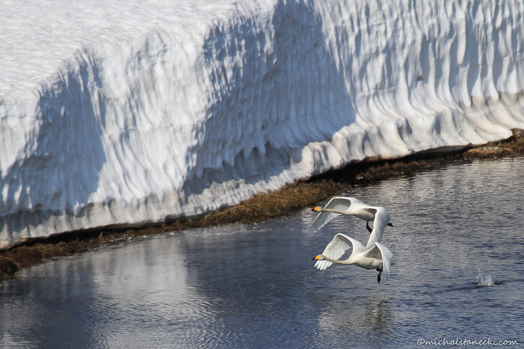 Cały czas jedziemy wzdłuż wybrzeża. Po typowym „arktycznym” pustkowiu porozrzucane sa małe jeziorka zasilane wodą z topniejącego śniegu. Śnieg w grubych czapach zalega tu w wielu miejscach. Podczas drogi cały czas towarzyszą nam ptaki. Co kilka minut robimy przystanki i wysiadam z auta, aby zmagać się z wiatrem i próbować zbliżyć do moich fotograficznych obiektów. Widzimy m.in. łabędzie krzykliwe, bataliony, wydrzyki i setki mew. Na każdym z większych jeziorek wypatrujemy nurów, jednak i tu nie udaje się nam zarejestrować tego północnego gatunku. W pewnym momencie kilkadziesiąt metrów przed nami do lotu wzbija się bielik. W powietrzu dostrzegamy drugiego. Podjeżdżamy kawałek i widzimy mocno nadjedzoną padlinę renifera. To tu ucztowały wielkie drapieżniki. Ach gdyby tak sfotografować bielika żerującego w tym miejscu – byłoby to pewnie świetne zdjęcie. Niestety. Spłoszony ptak odleciał.