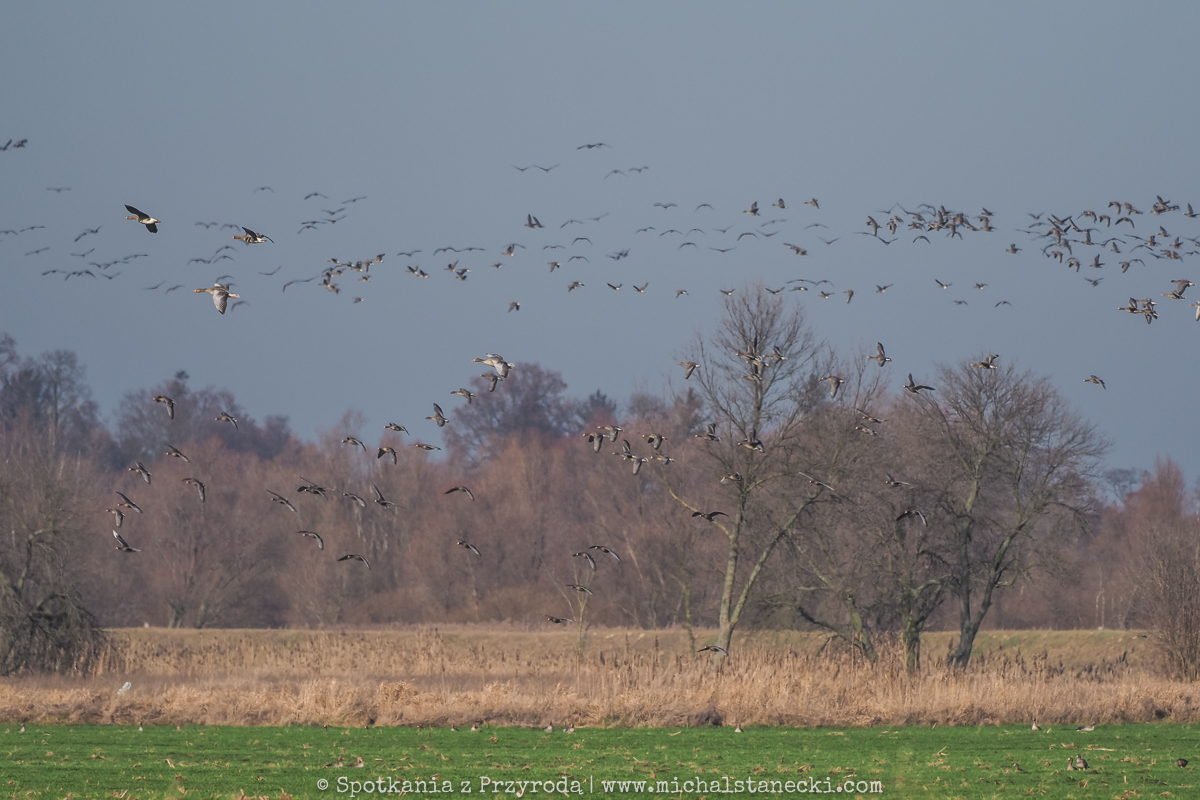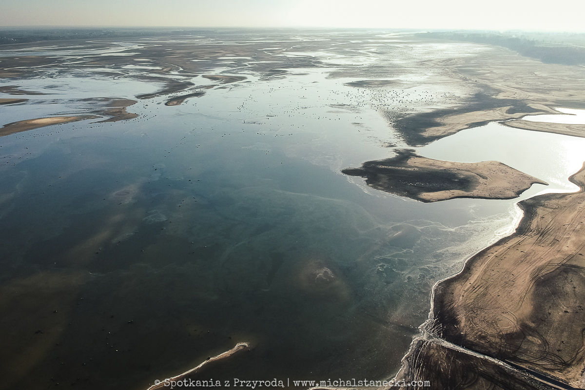 Na samym zbiorniku gęsi były tysiące. Ogromne stada siedziały rozciągnięte wzdłuż osi tzw. cofki. Niektóre zrywały się do lotu, inne nadlatujące schodziły do lądowania. Co jakiś czas płoszone przez bieliki (było ich aż 7) nie miały za dużo spokoju. Z powietrza odzywały się żurawie, które kręciły się na trasie zbiornik – pola. W kilku miejscach na błocie widać było pojedyncze czajki. Licznie kręciły się śmieszki i większe mewy białogłowe.