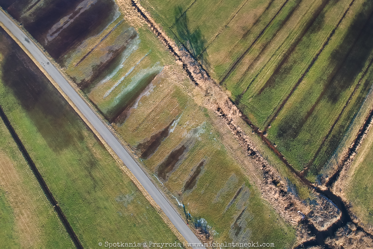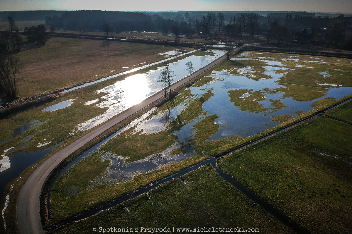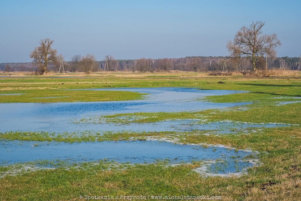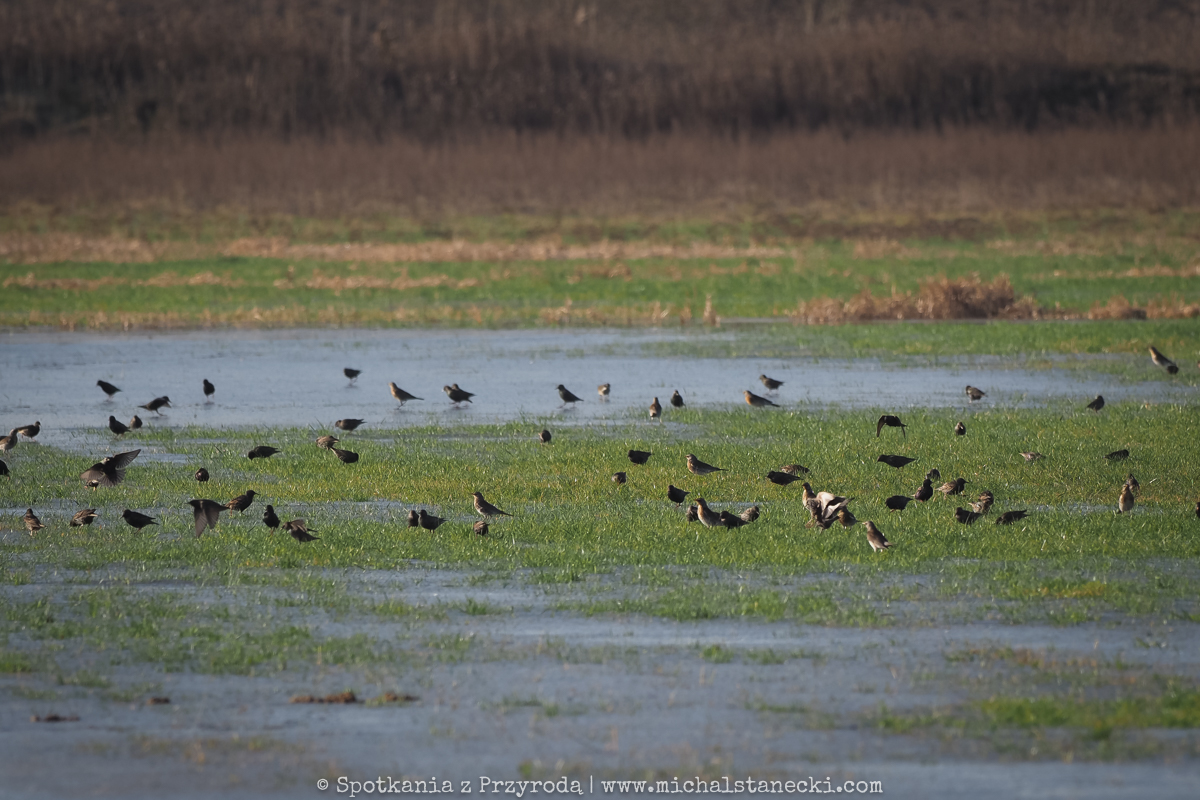 W sobotę od samego rana po „naszym lesie” uwijały się ptaki. Sikory kilku gatunków, kowaliki, dzięcioły duże i hałaśliwe sójki. Po wczesnym śniadaniu ruszyliśmy w drogę. Pierwszy przystanek zrobiliśmy już po kilkunastu minutach jazdy, na rozlewiskach Neru niedaleko Małynia. Na zalanych (częściowo zamarzniętych) polach zobaczyliśmy stado kwiczołów i szpaków. Nacieszyliśmy oczy i ruszyliśmy dalej.