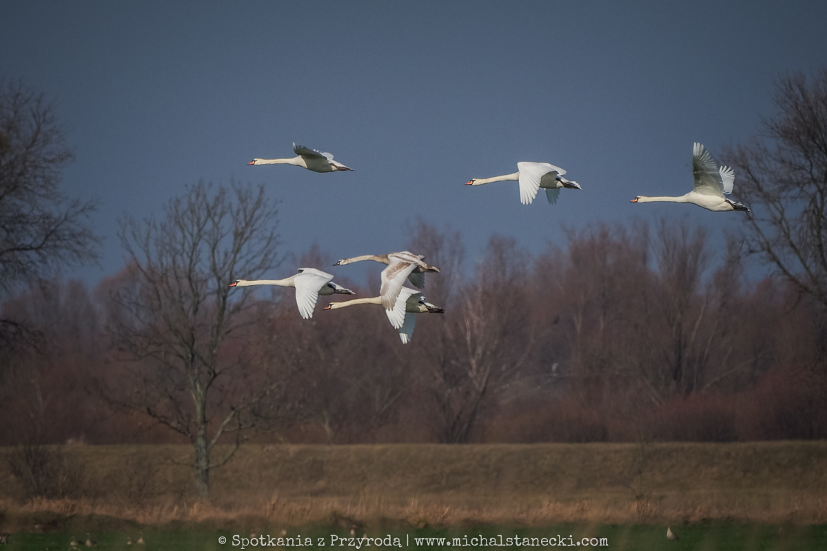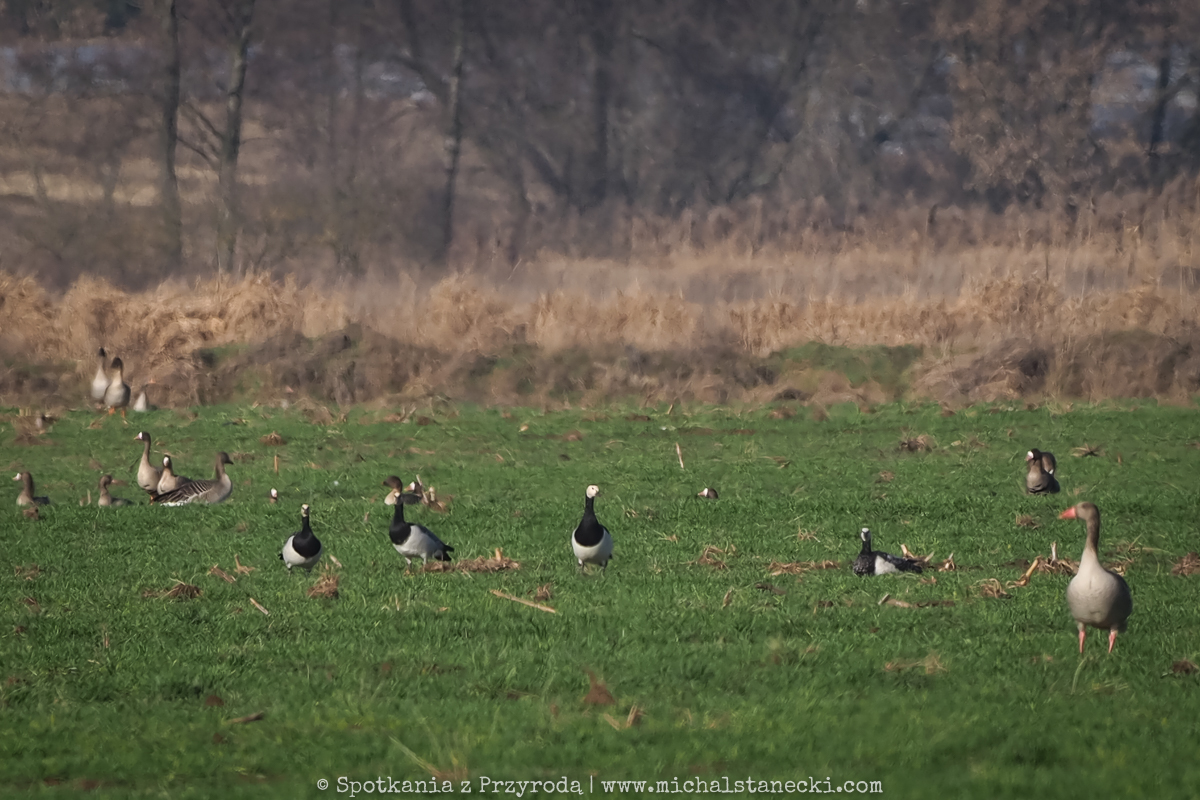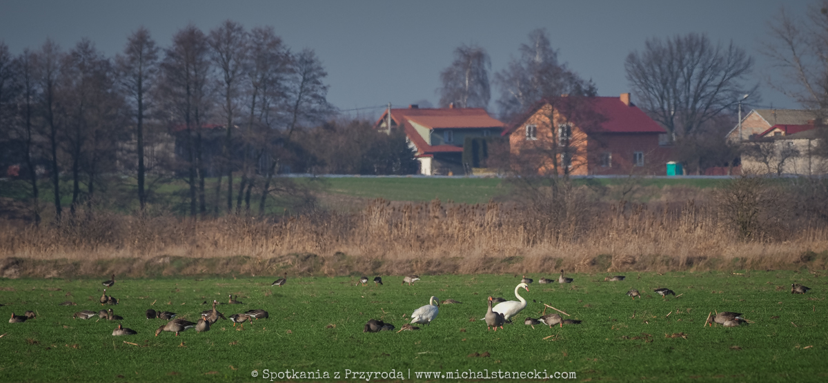 Po powrocie do auta ruszyliśmy w stronę Jeziorska. Pierwszy przystanek zrobiliśmy za mostem na Warcie. Już z daleka było widać „pasące się” tam łabędzie. Gdy wysieliśmy, zobaczyliśmy też spore ilości gęsi rozsianych na dość dużym obszarze. Trzeba było uruchomić lunetę. Wszystkie łabędzie okazały się niemymi. Było ich około 80. Oprócz gęgaw, gęsi białoczelnych i zbożowych ( w sumie kilkaset ptaków) udało się wypatrzeć cztery bernikle białolice i jedną nietypowo wybarwioną gęś, będącą prawdopodobnie międzygatunkowym mieszańcem. Na łące stacjonowały również czaple siwe.