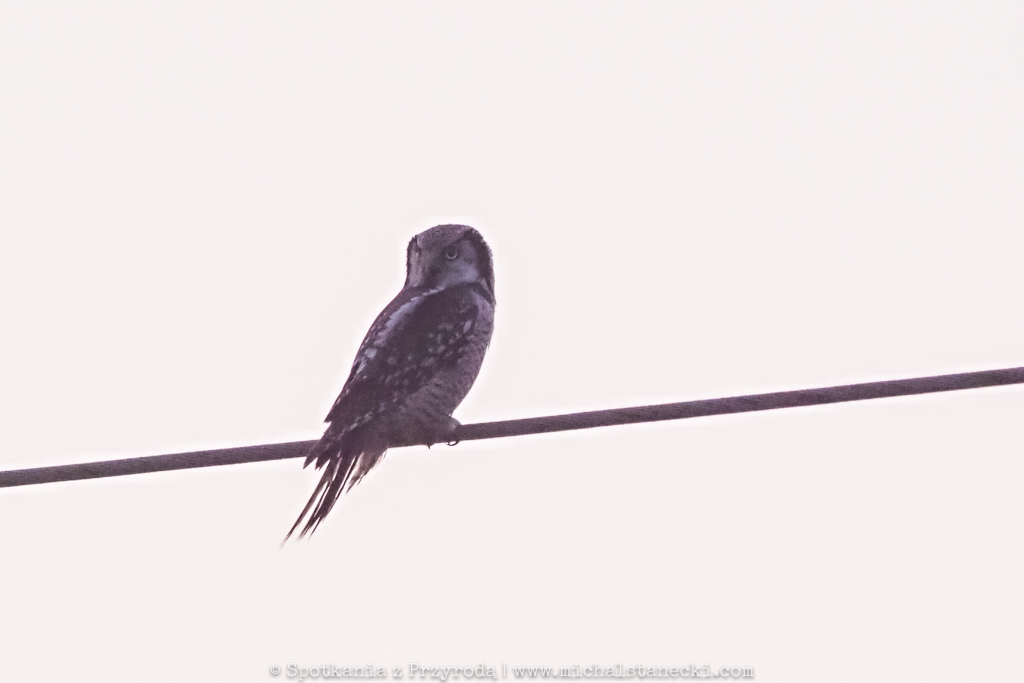Wychodzę rano w teren. jest 6:30. Na zewnątrz jeszcze szaro. Kątem oka dostrzegam siedzącą na drucie lini energetycznej pustułkę. Zabieram z samochodu lornetkę i przez furtkę wychodzę z terenu pensjonatu. Zaraz, zaraz, jak to pustułkę? Co pustułka robi tam tak wcześnie? Światła do polowania jest póki co niewiele. Przykładam do oka aparat, rozjaśniam obraz i robię kilka klatek. Zerkam na wyświetlacz i … Nie, to przeciez nie jest możliwe. Patrzy na mnie sowa. Jasna głowa, żółte oczy, ciemniejszy tył. To sowa jarzębata!!! Ale jak to możliwe? Co ten ptak z Północy robiłby nad trawnikiem pensjonatu gdzieś w Polsce… Biegnę obudzić żonę, która nie może przegapić takiej okazji. Po chwili schodzi na dół ciągle niedowierzając. Mówi mi, że może to włochatka, że w słabym świetle mogłem coś pokręcić. Że za bardzo się podekscytowałem… Widzi ptaka, który przeleciał ciut dalej i siedzi na słupie. Jakby skulona. Nie widać ogona. Jej sylwetka jest teraz dość krępa. Dla niewprawionego obserwatora, który wcześniej nie wiedział na żywo ani włochatki, ani tym bardziej sowy jarzębatej, w tym słabym świetle różnice wcale nie muszą być takie oczywiste. W tym momencie na budowę sąsiadującą z trawnikiem przyjeżdzają robotnicy. Rozmawiając głośno wypakowują narzędzia i ptak odlatuje… Na szczęście po tym krótkim i niewiarygodnym spotkaniu pozostał dowód w postaci kilku zdjęć. Te dają potwierdzenie.