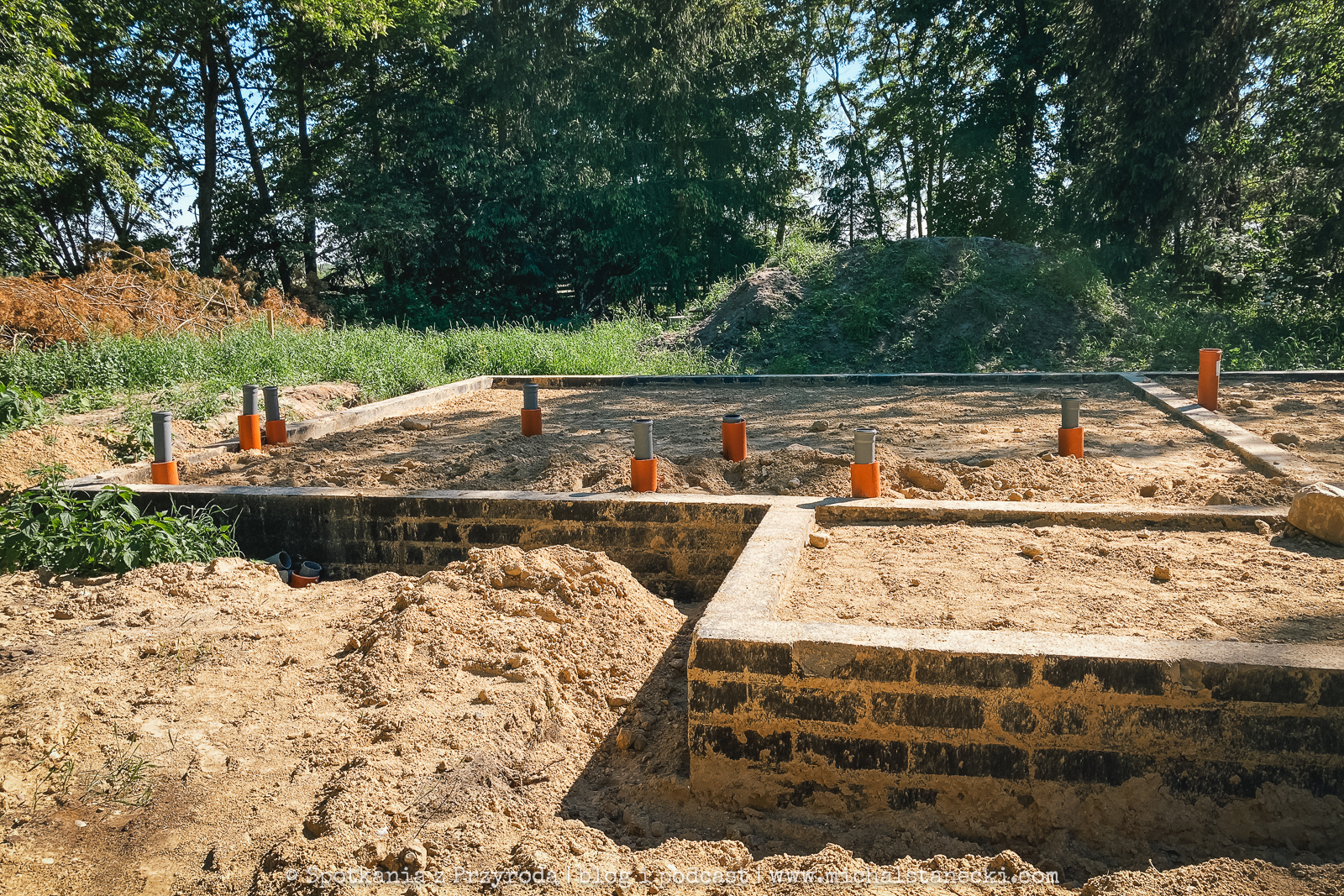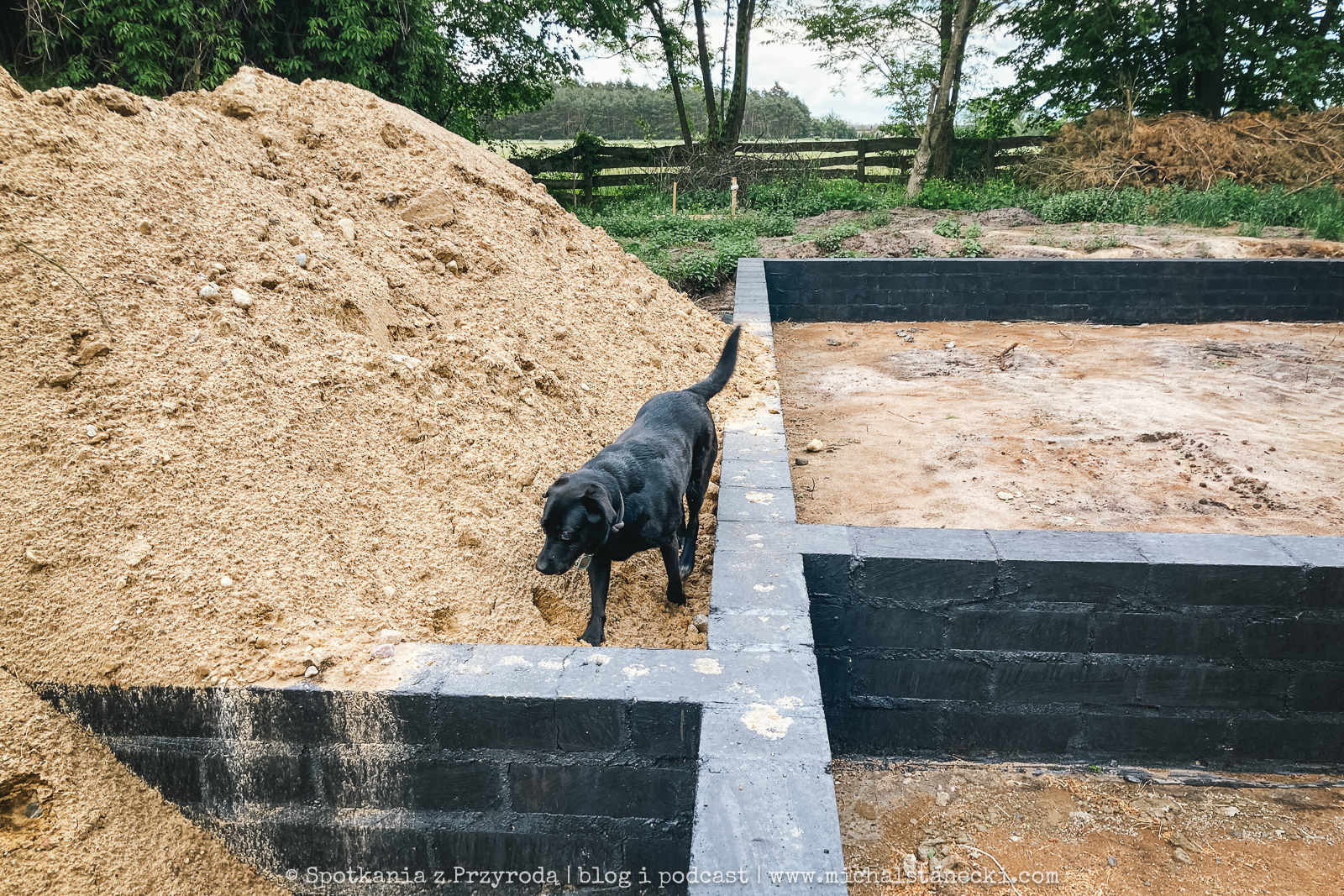 Gmina dofinansowuje nam budowę ekologicznej oczyszczalni ścieków. Okazyjnie kupujemy dachówkę. Na budowie pojawiają się duże ilości piachu i innych materiałów. Centrum działki zamienia się niestety (to jednak nieuniknione) w klasyczny plac budowy.
