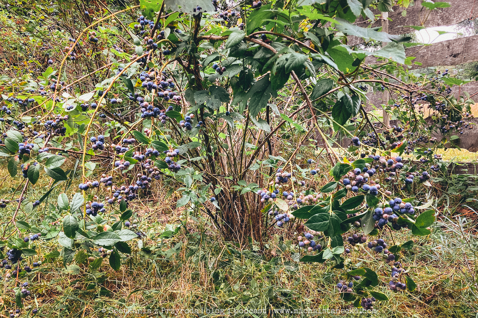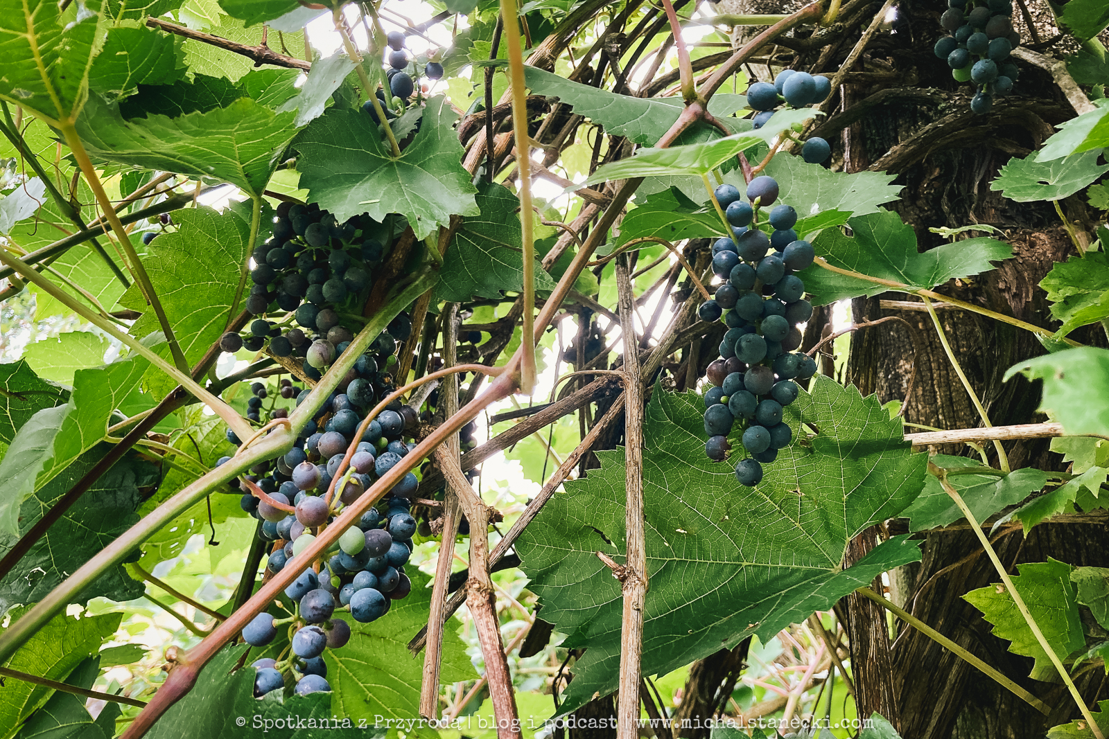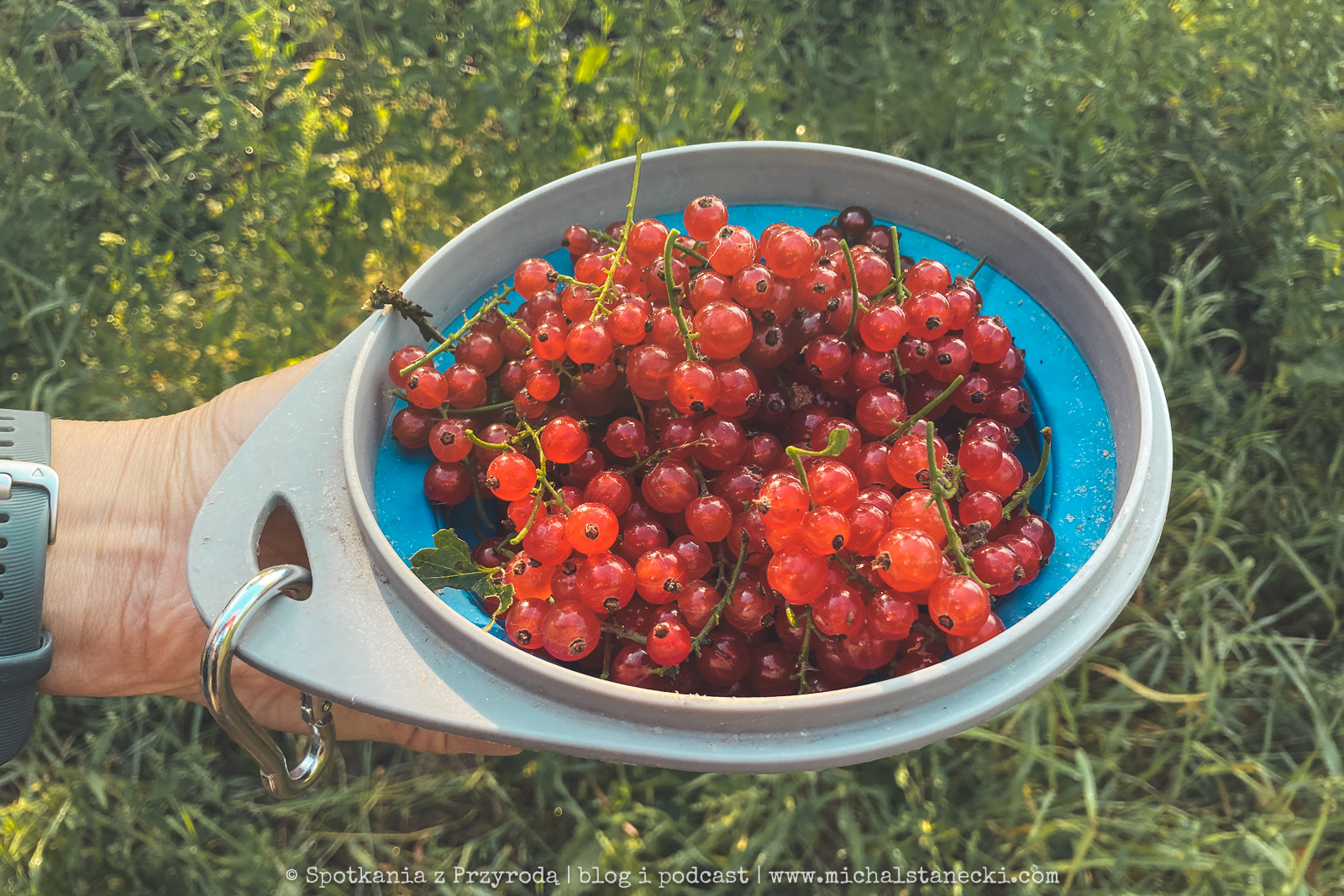 Przycinamy winogrona, które obsypują się zawiązkami owoców. Krzewy borówkowe też zaczynają się uginać pod ciężarem zielonych jeszcze owoców. Czerwone porzeczki na wielkich starych krzewach obficie owocują, a na malutkich krzaczkach pojawiają się nieliczne poziomki…