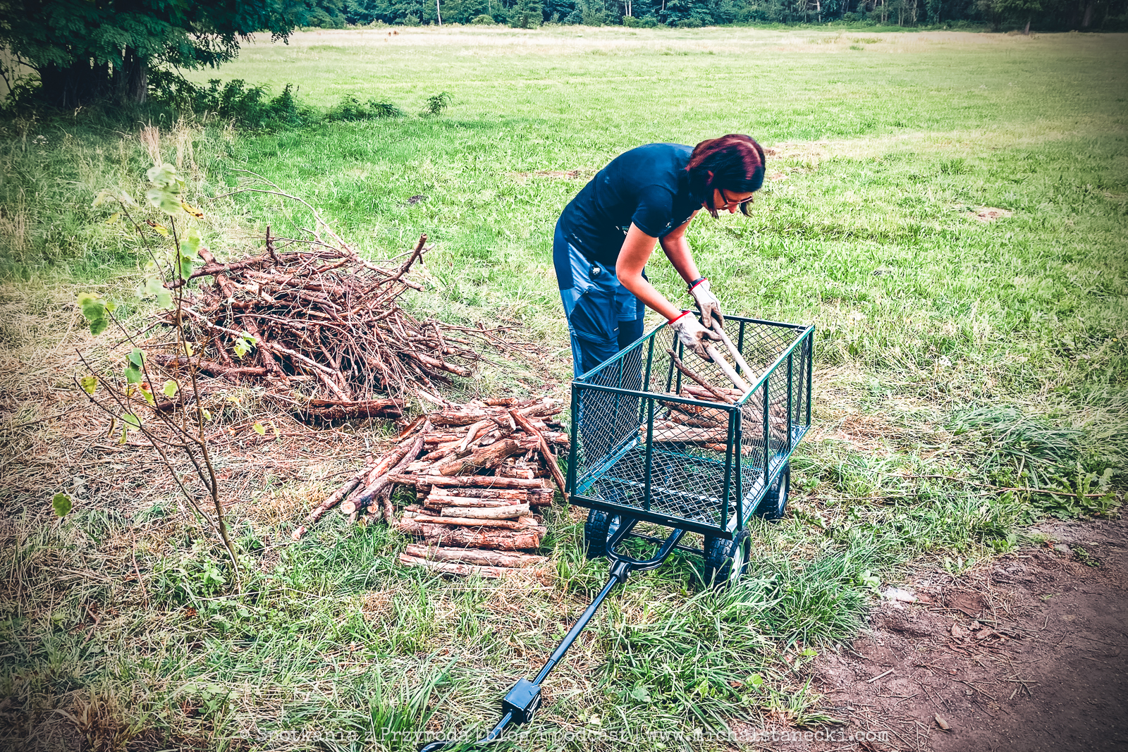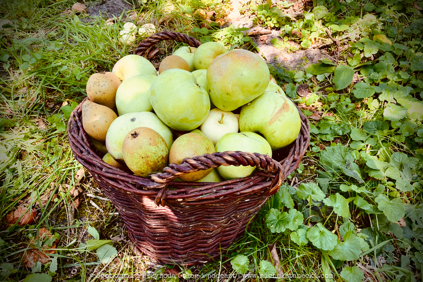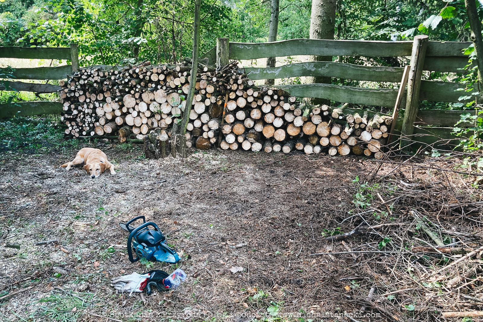 W ogrodzie tnę na kawałki pościnane wcześniej drzewa i zwozimy materiał opałowy do stodoły. Część układam w pryzmy i zostawiam do sezonowania na zewnątrz. Zbieramy borówki i pierwsze jabłka. Jabłonie mocno obrodziły i owoców jest cała masa. Jabłka są krzywe, mają trochę plamek i całkiem sporo robaków :-) Prawdziwe ekologiczne jabłka z własnego sadu!